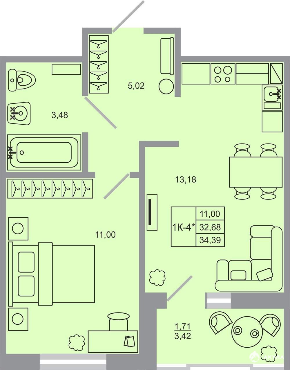 Жилая площадь 11 м2, кухня 13.18 м2, чистовая отделка, комнаты изолированные, балконов - 1.