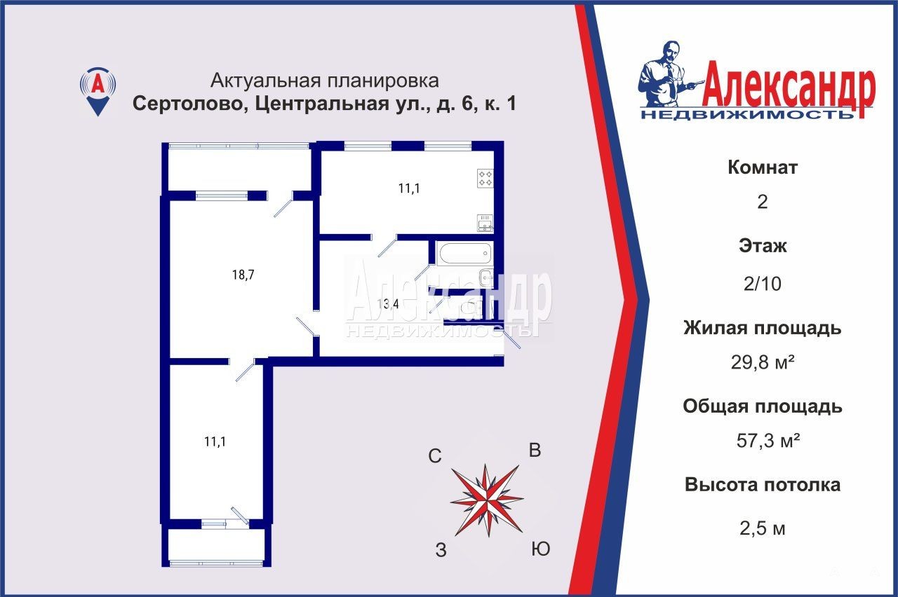 1706280 Предлагается к продаже семейная квартира, общей площадью 60, 2 кв.м. с удобной планировкой в центре г. Сертолово.