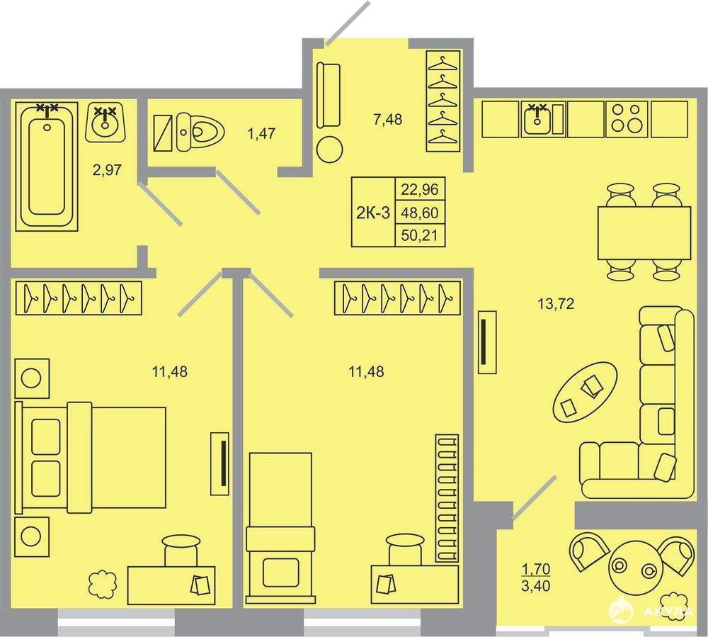Жилая площадь 22.96 м2, кухня 13.72 м2, чистовая отделка, комнаты изолированные, лоджий - 1.