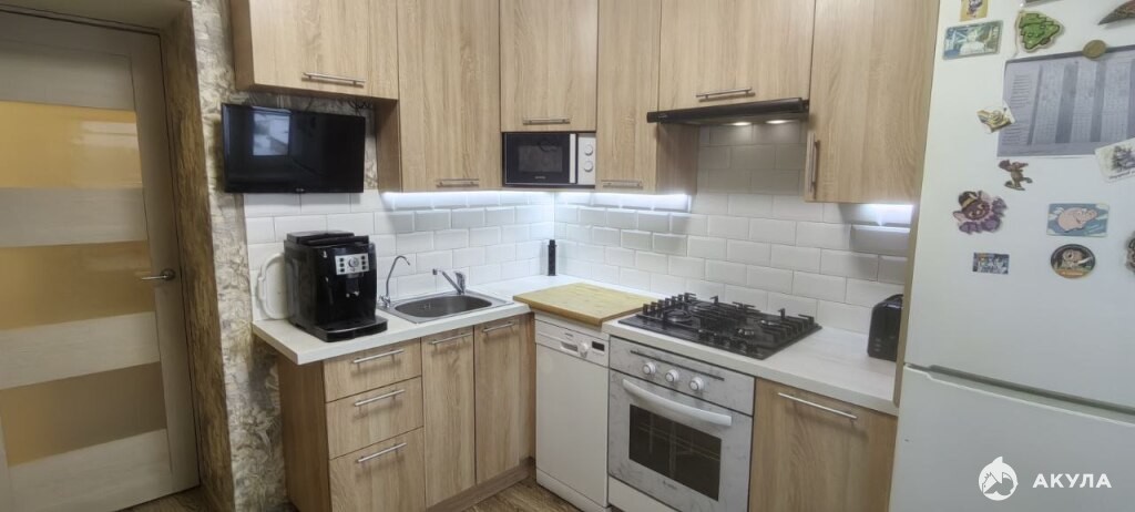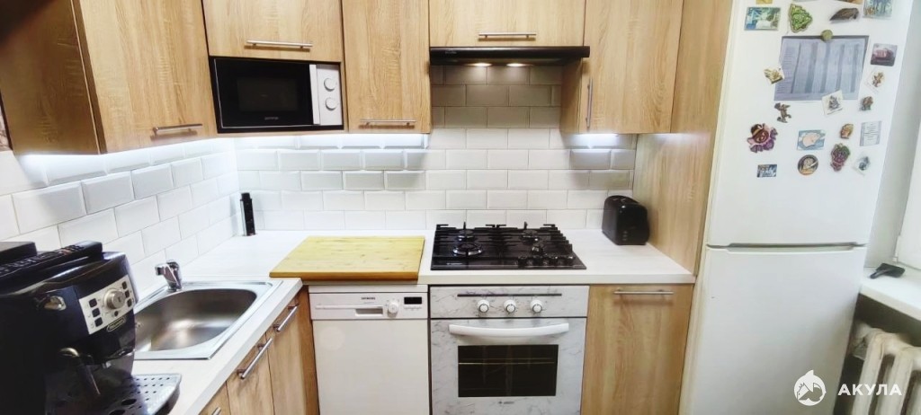 Остаётся кухня с встроенной техникой: варочная поверхность, газовая духовка, посудомоечная машина, вытяжка.
