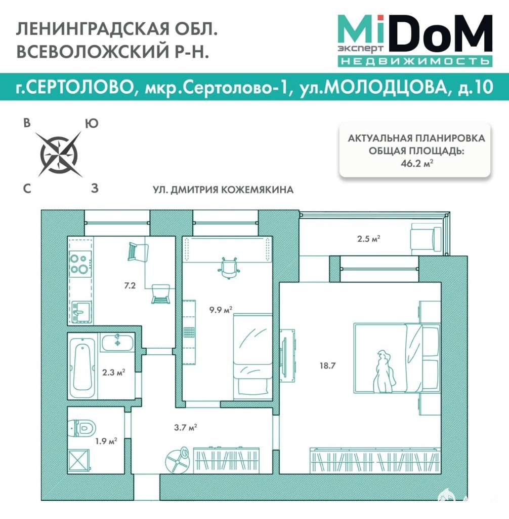 Общая площадь: 46, 2 кв.м