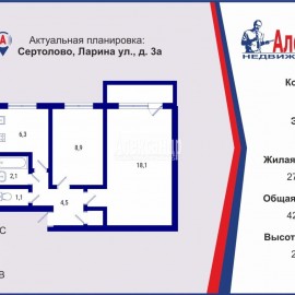 №342807 (168) В тихом уютном уголке п. Ленинское Выборгского района Ленинградской области предлагается в продажу просторная светлая 3 кв общей площадью 65, 7 кв.м, расположенная в крупно-панельном доме 1982 г.п. Площадь комнат составляет 17, 4 + 15, 3 + 13, 3 кв.м., кухня 6, 9 кв.м., с/у...