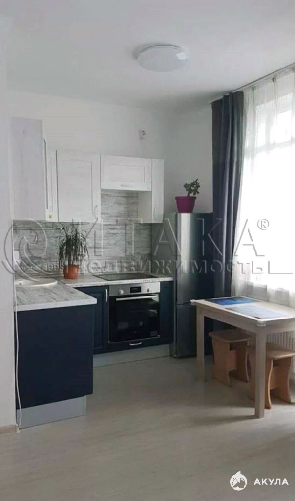 Уникальность студии в зонировании спальной зоны, встроенная кухня с бытовой техникой остаётся новым собственникам.