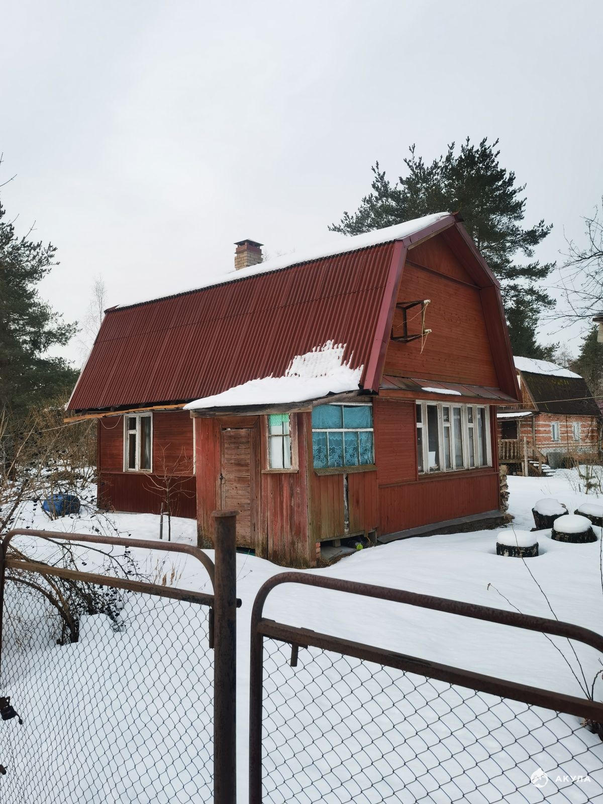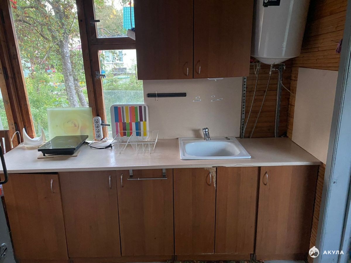 Садовый дом находится на краю участка. Благодаря этому есть много свободного места или для строительства нового дома или для любого другого использования участка. Участок расположен вдоль линии, есть удобный заезд. Ограждение – сетка рабица.