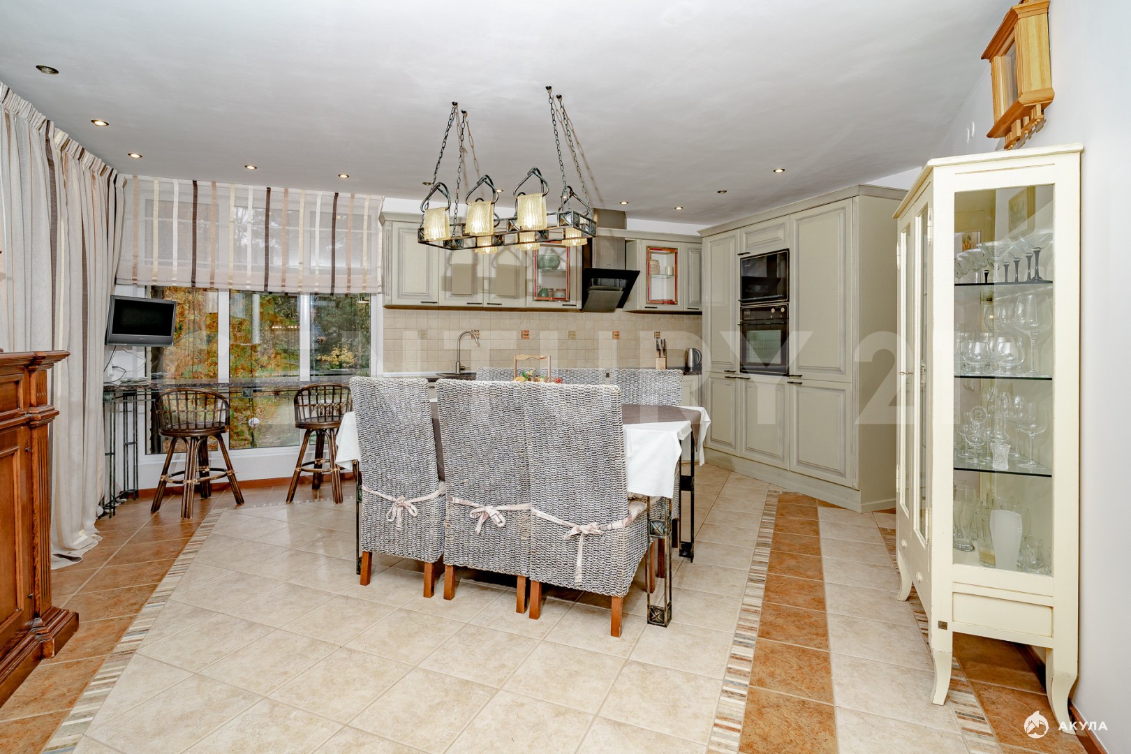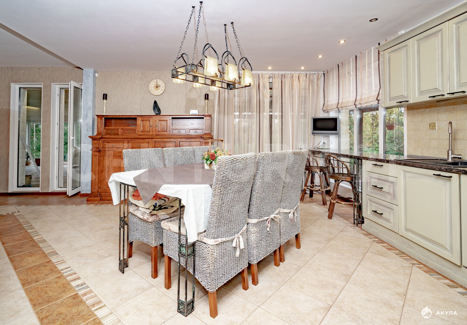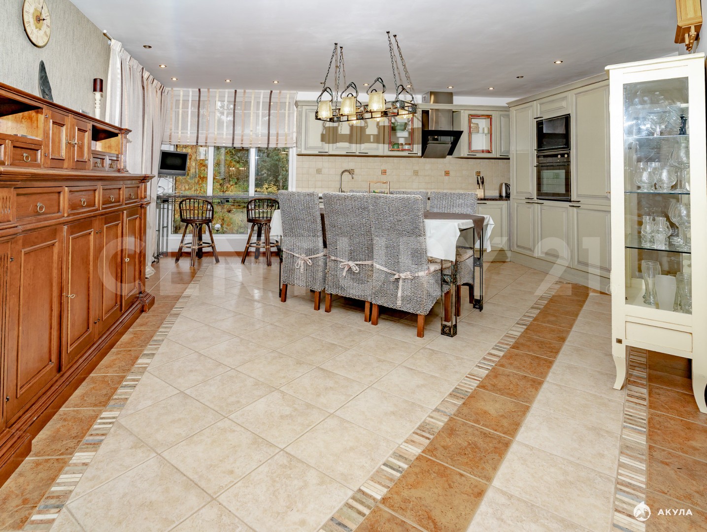 · Просторная кухня-гостиная (90 м²) с камином: дизайнерский интерьер, панорамные выходы на террасу и в сад, современная техника и большая обеденная зона. Идеально для приема гостей и семейных вечеров.