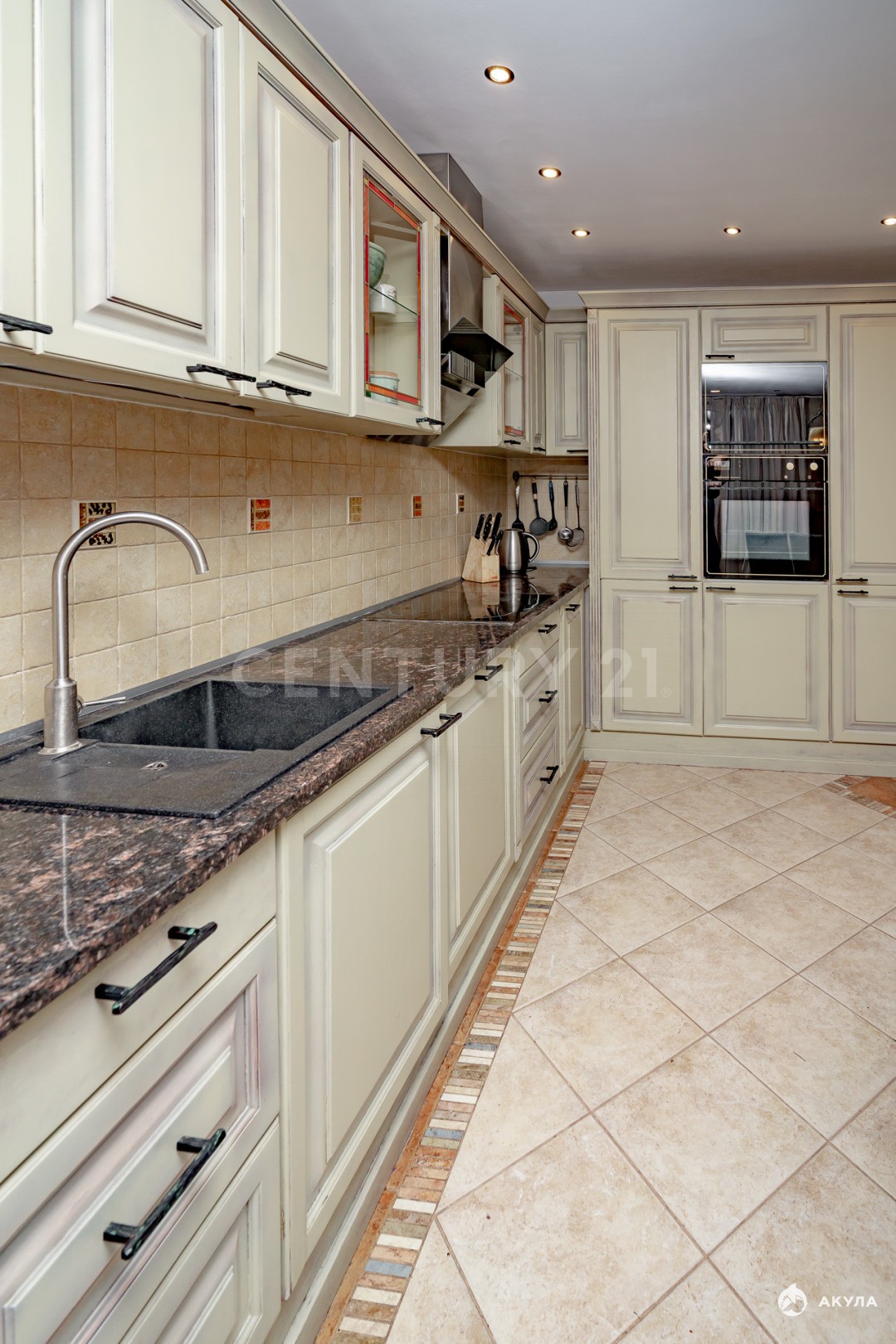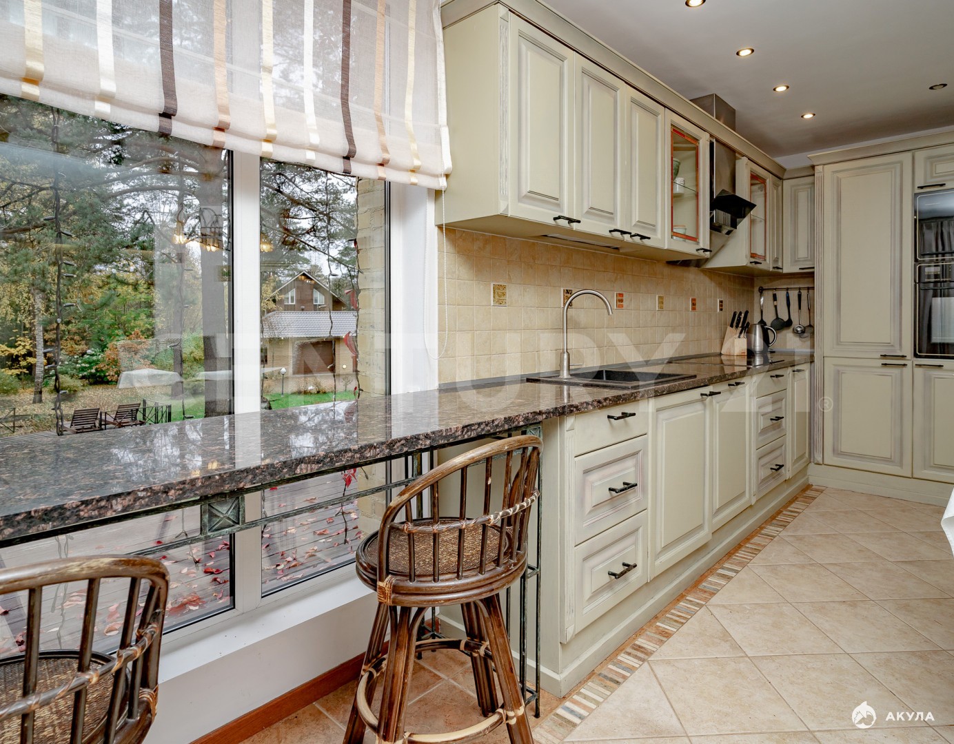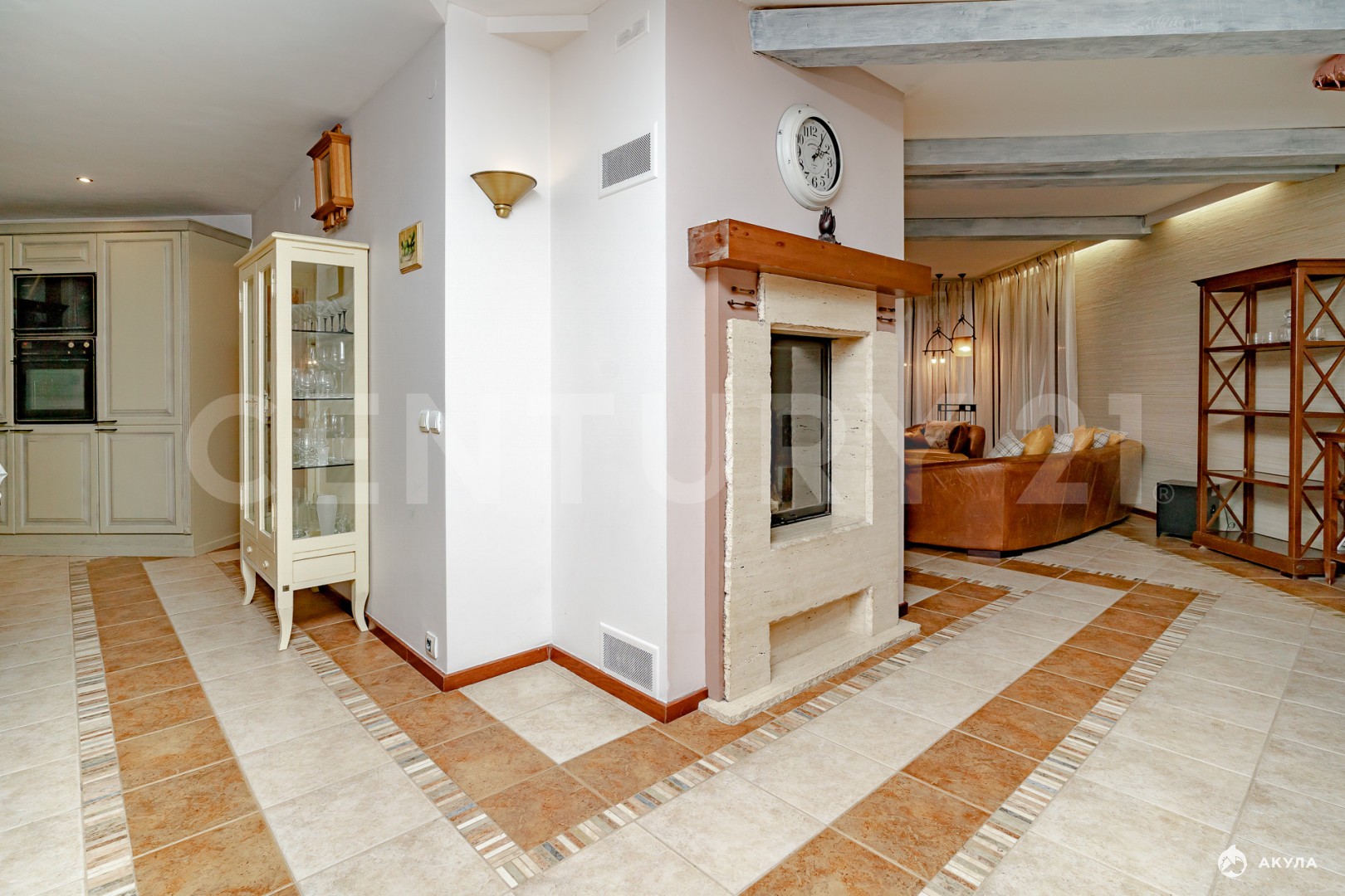 · Просторная кухня-гостиная (90 м²) с камином: дизайнерский интерьер, панорамные выходы на террасу и в сад, современная техника и большая обеденная зона. Идеально для приема гостей и семейных вечеров.
