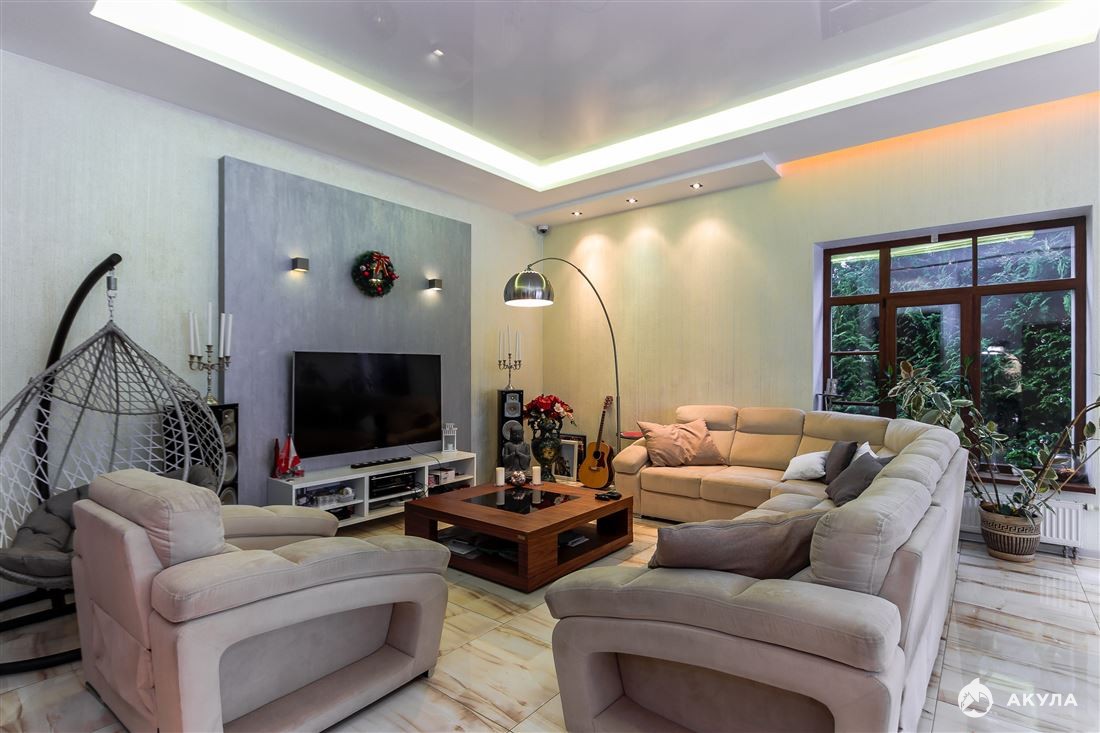 На втором этаже находится большая спальня с гардеробной, гостевая комната, кабинет и ванная. В ванной есть стиральная машина. В кабинете телевизор. В доме есть терраса и балкон на втором этаже.