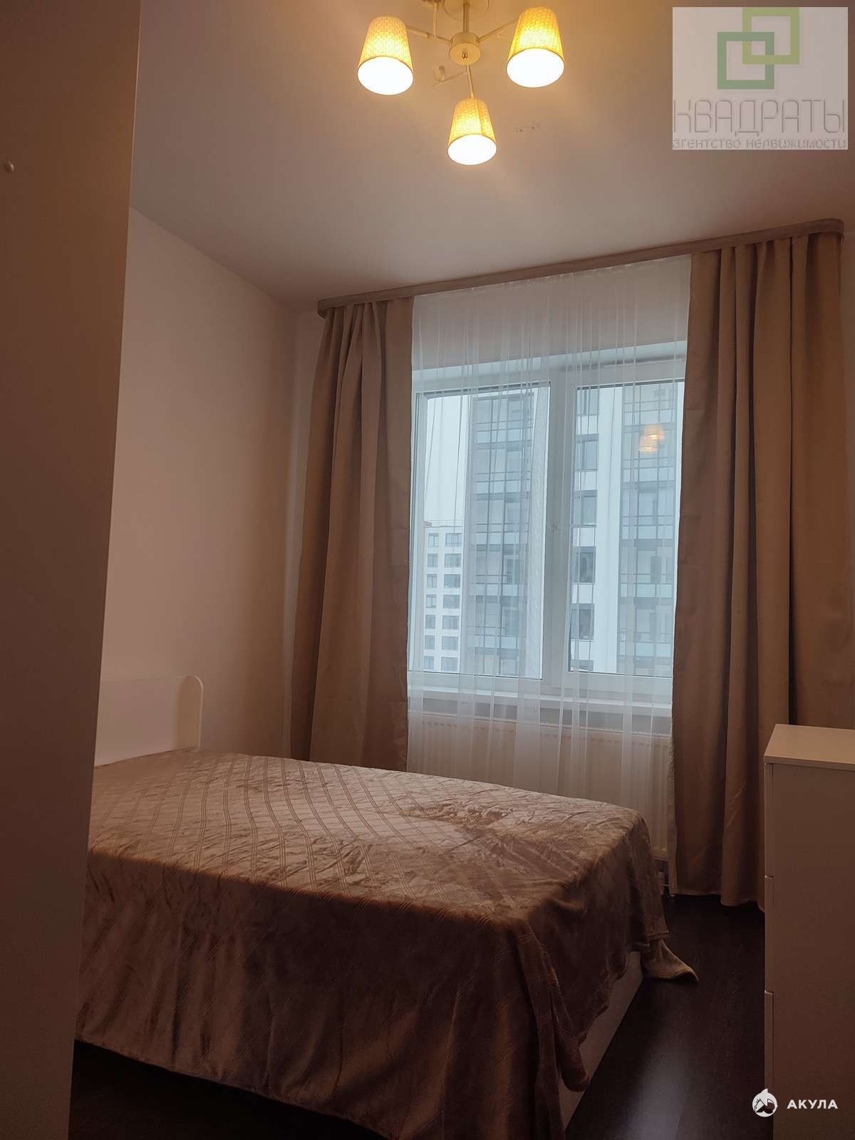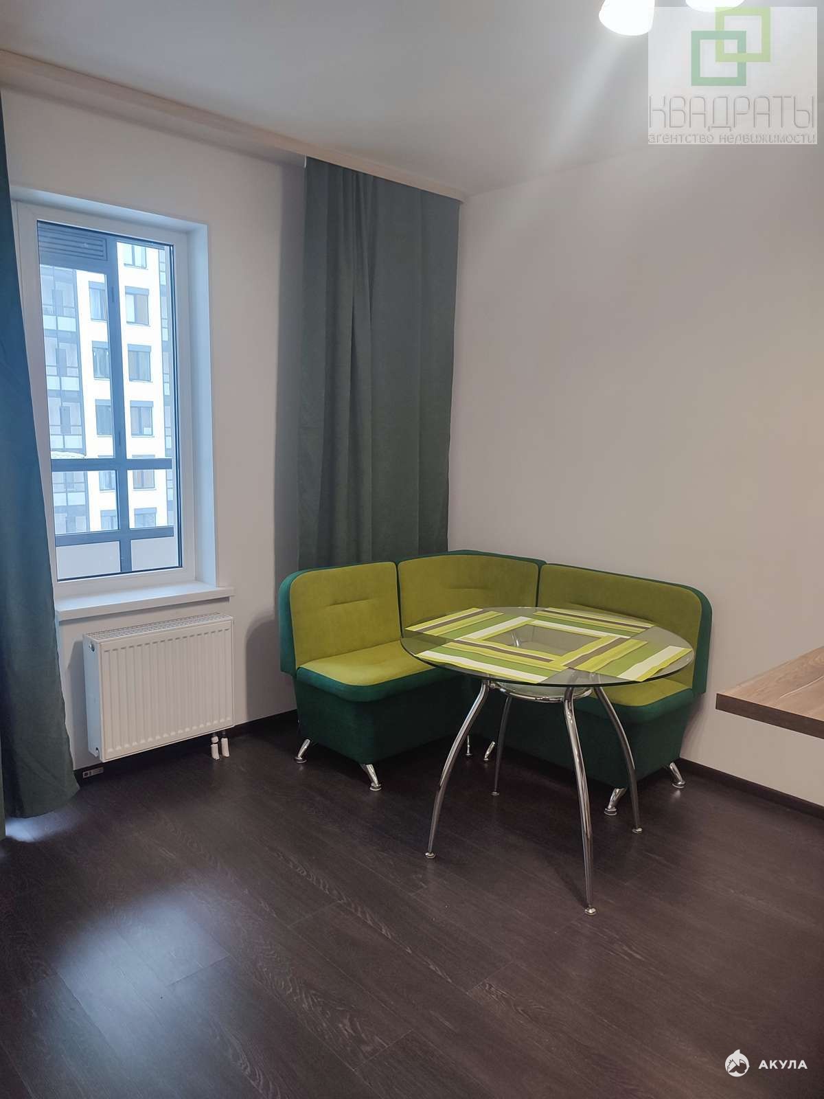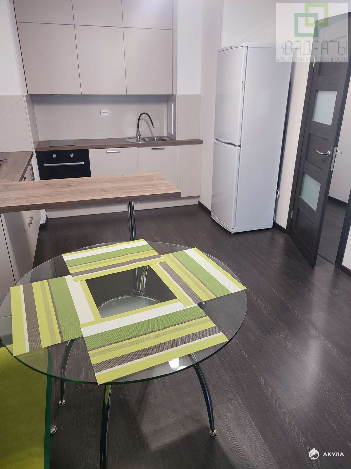 Квартира в отличном состоянии. Площадь 34, 2 м2 : кухня - студия15 м2 + спальня 10 м2. Меблирована: кровать, шкаф-купе, комод, стеклянный обеденный стол с угловым диваном, кухонный гарнитур с барной стойкой, 2-х камерный холодильник, посудомоечная машина, плита и духовка, вытяжка, стиральная машина, прихожая.