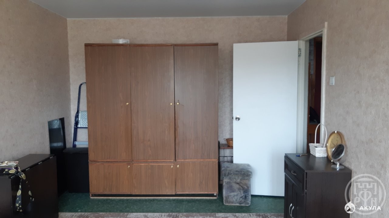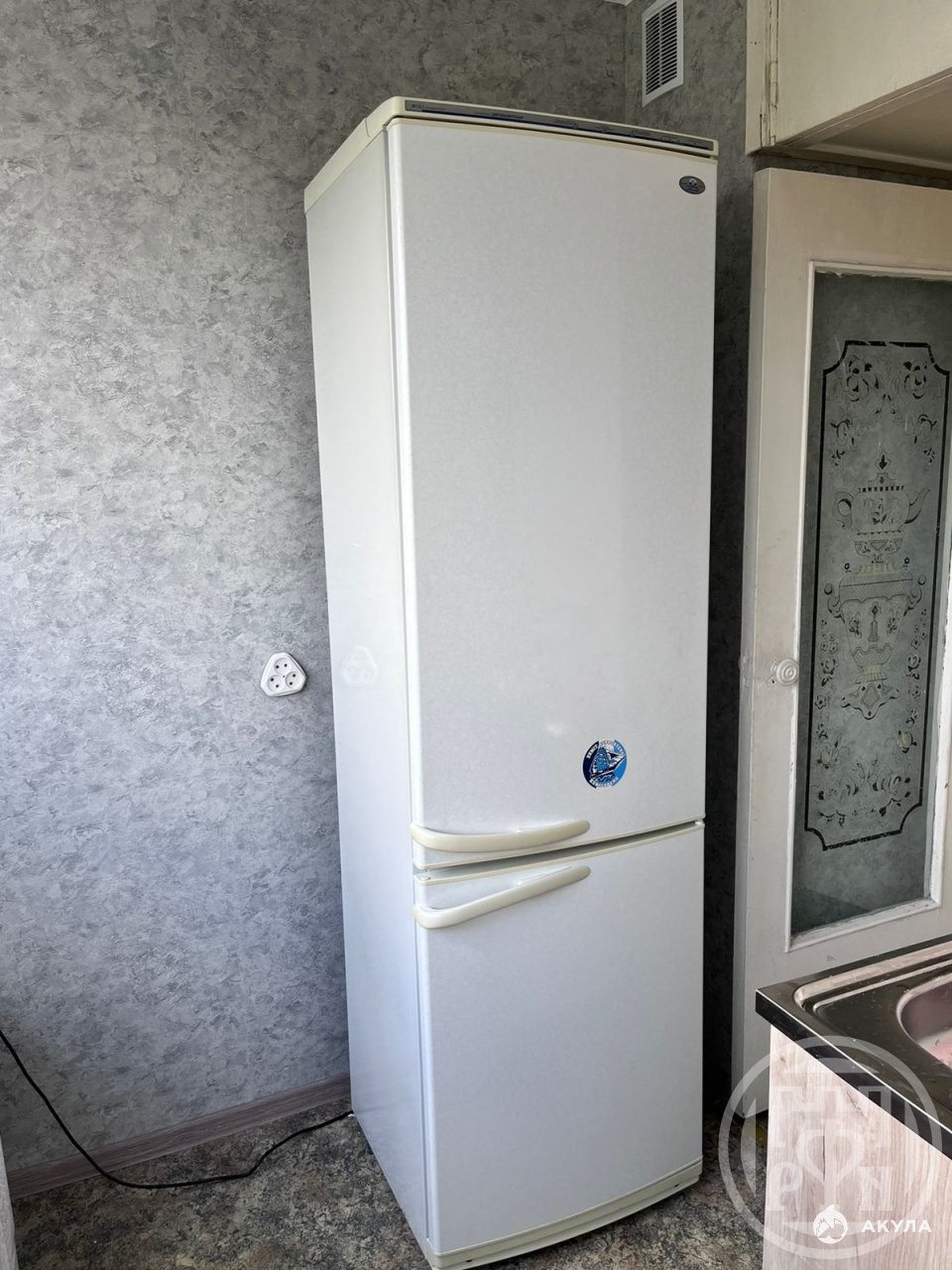 Большой раскладной двухспальный диван в комнате, кресло, тумба, платьевой шкаф, холодильник, стиральная машина, плита - газовая