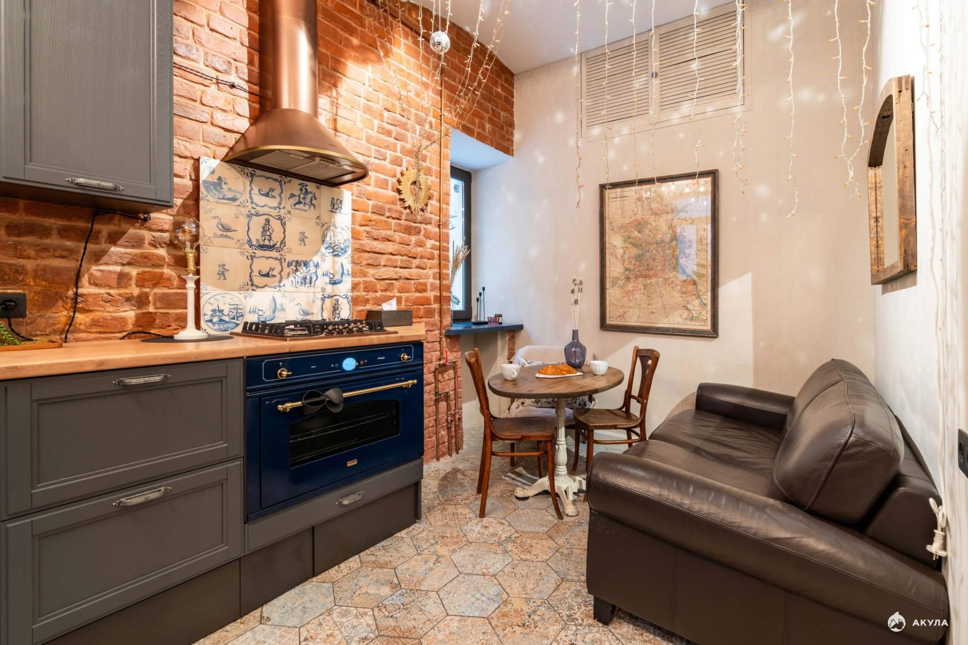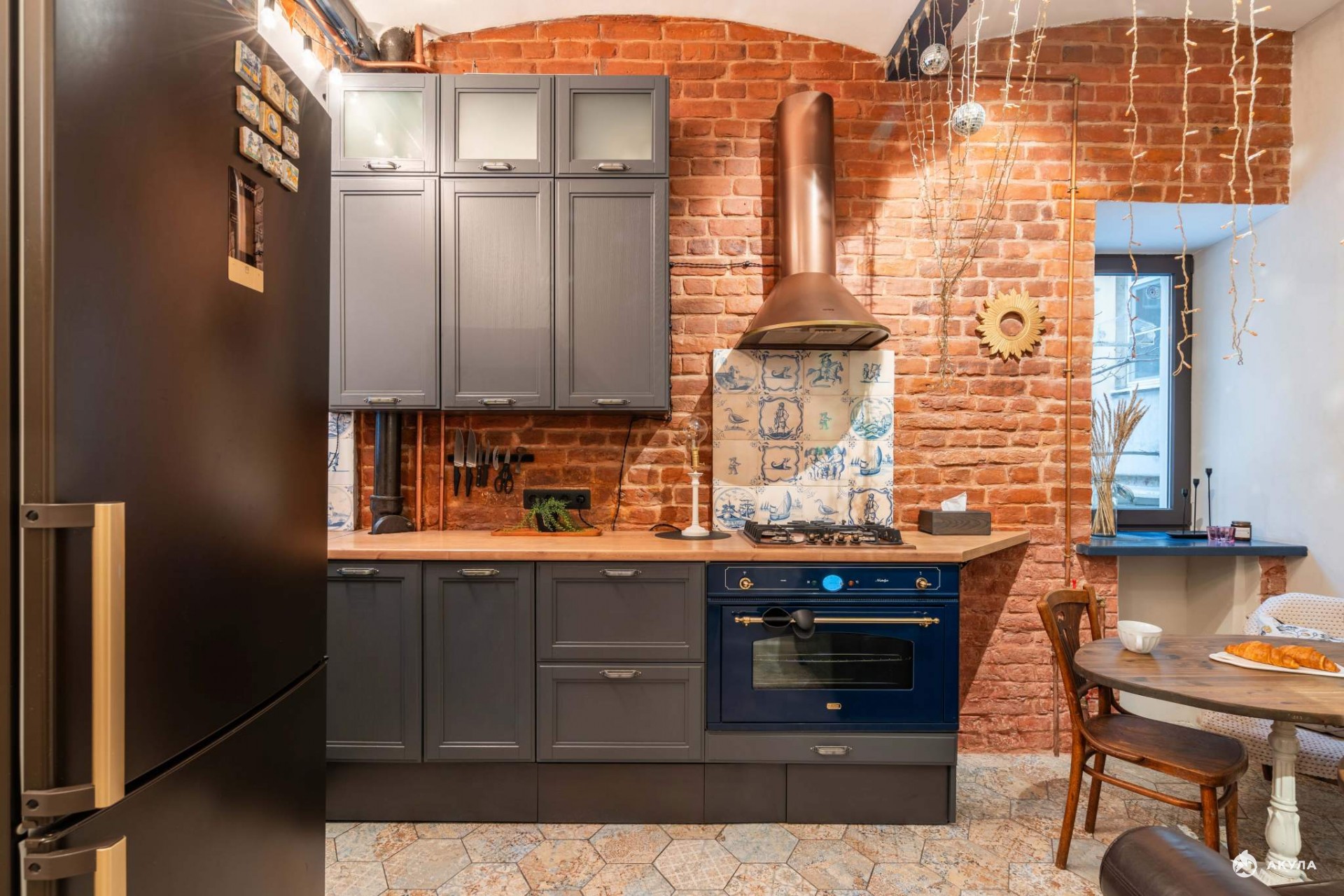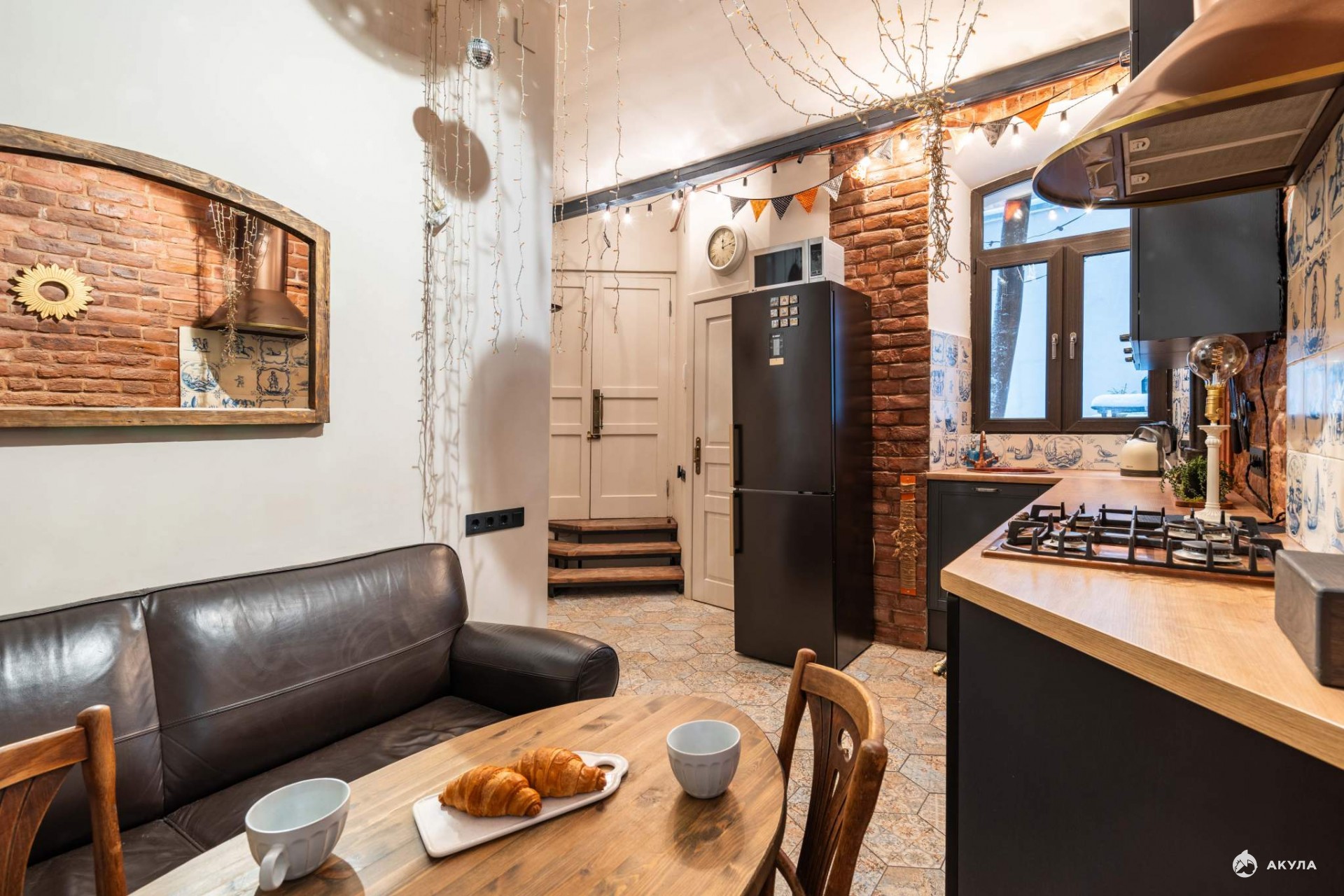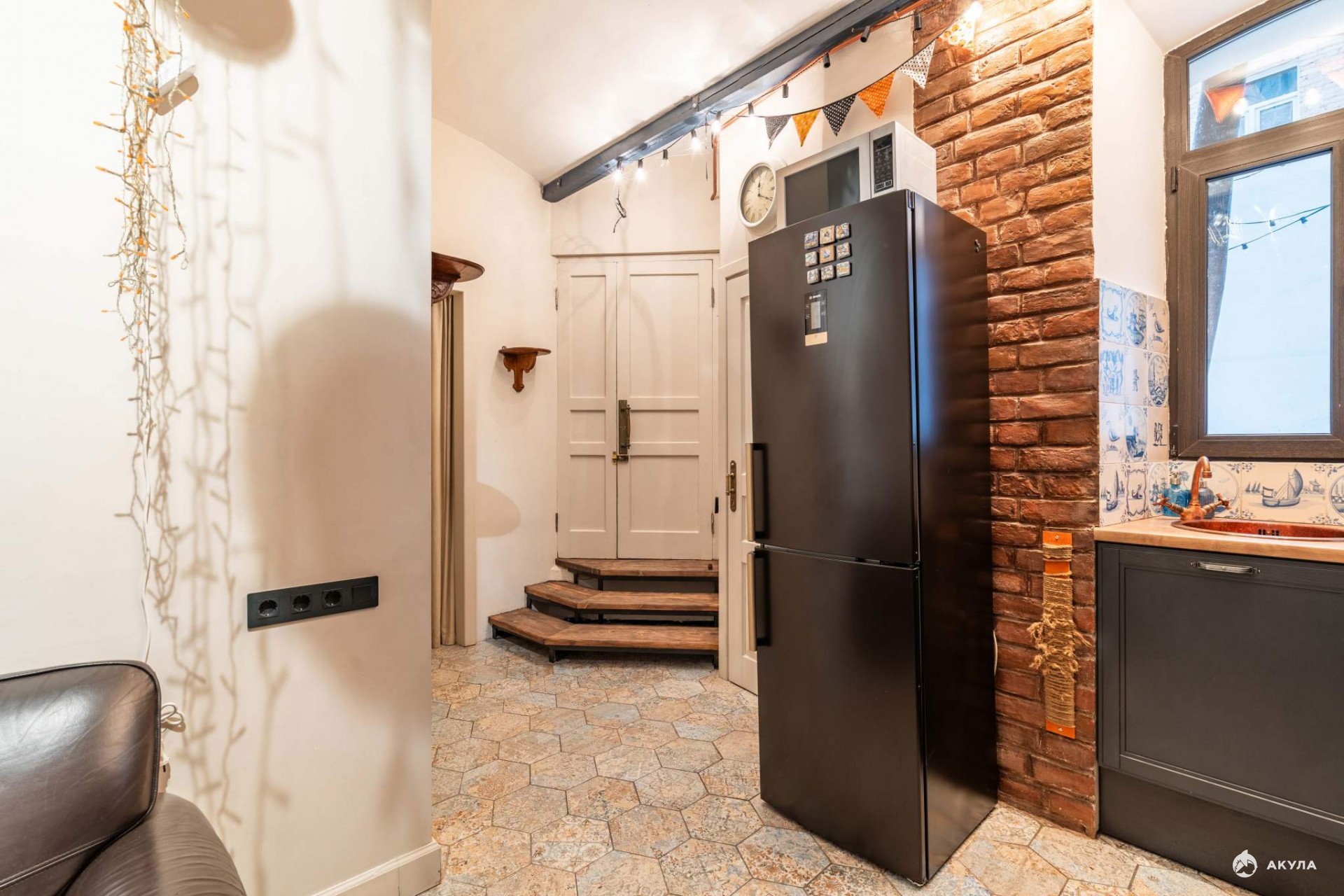 Дизайн квартиры выполнен в стиле Лофт. Здесь тихо и по-особому уютно. Окна кухни выходят на небольшой дворик для летних посиделок на свежем воздухе. Здесь можно посадить цветы, устроить барбекю или собрать гостей на дружескую вечеринку. Во дворе проведено электричество и вода.