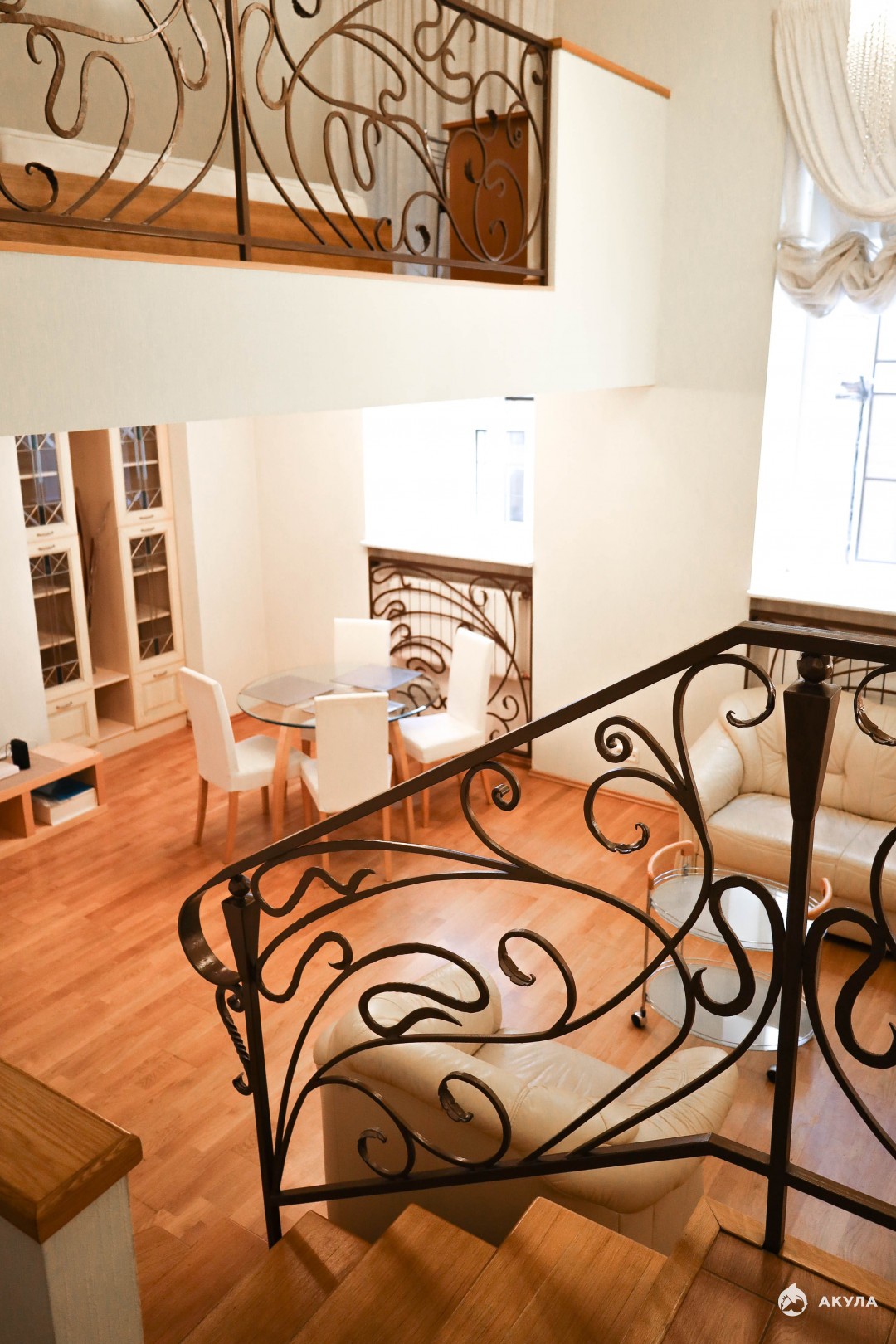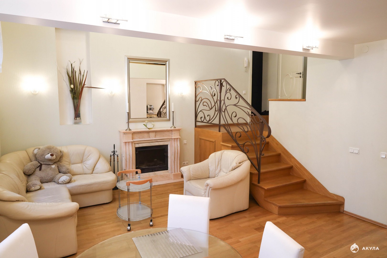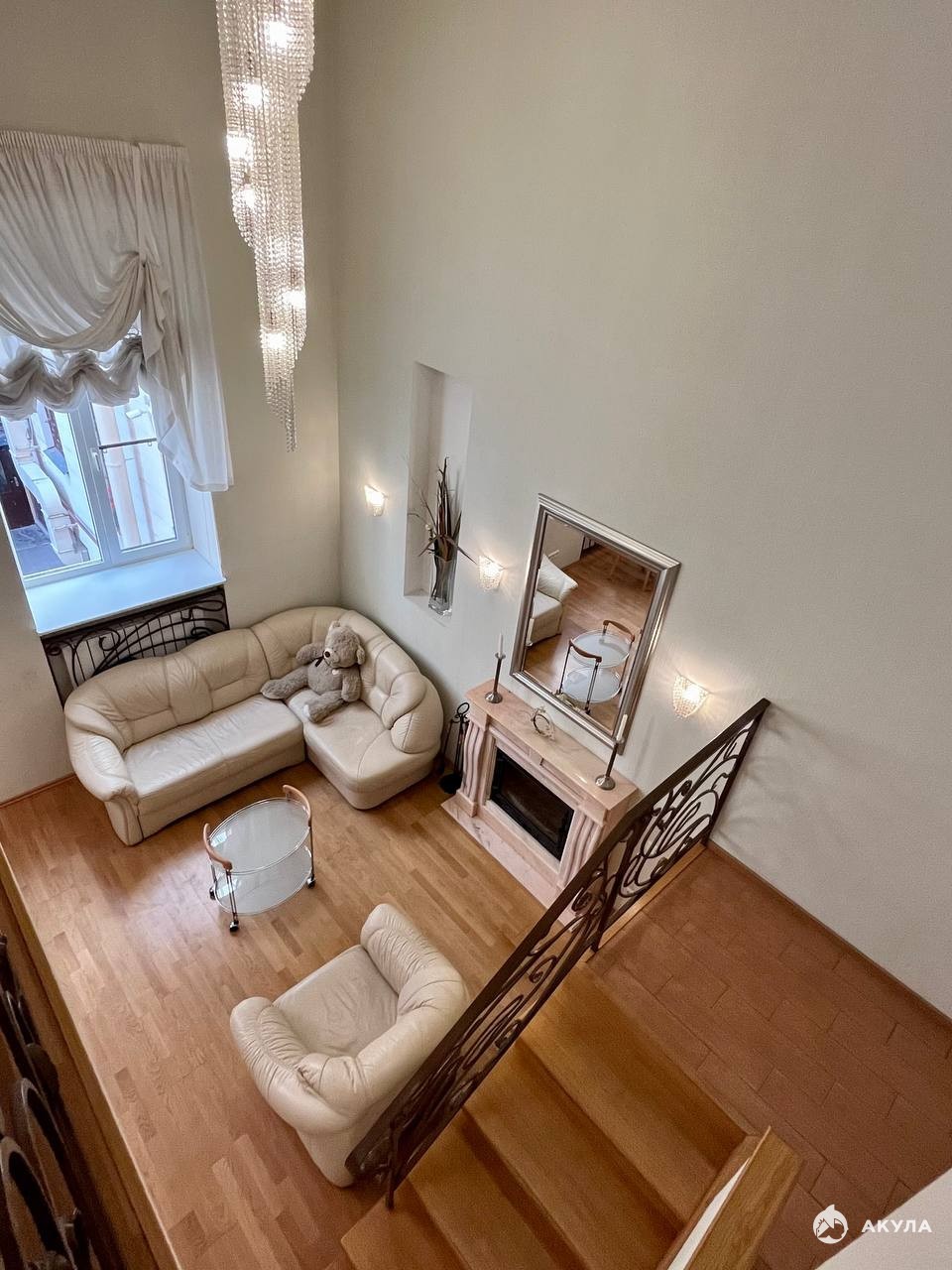 На втором этаже обустроена спальня и гардеробная комната. Два санузла, джакузи и душевая кабина, макияжные зоны. В гостиной действующий камин из мрамора, обеденный стеклянный стол с 4 стульями, ТВ. Интернет подключен. В зоне двойного света потолки 5 метров!