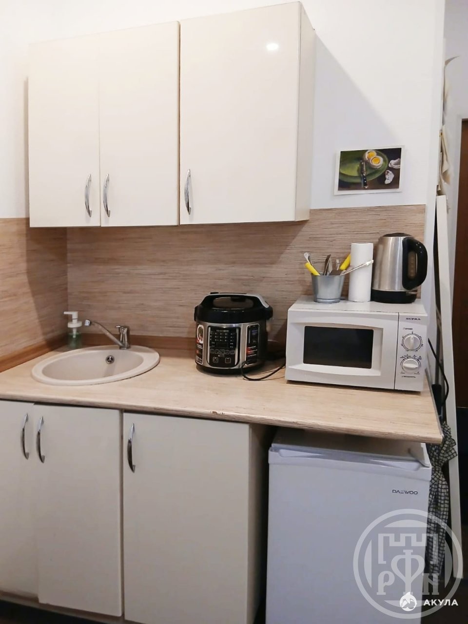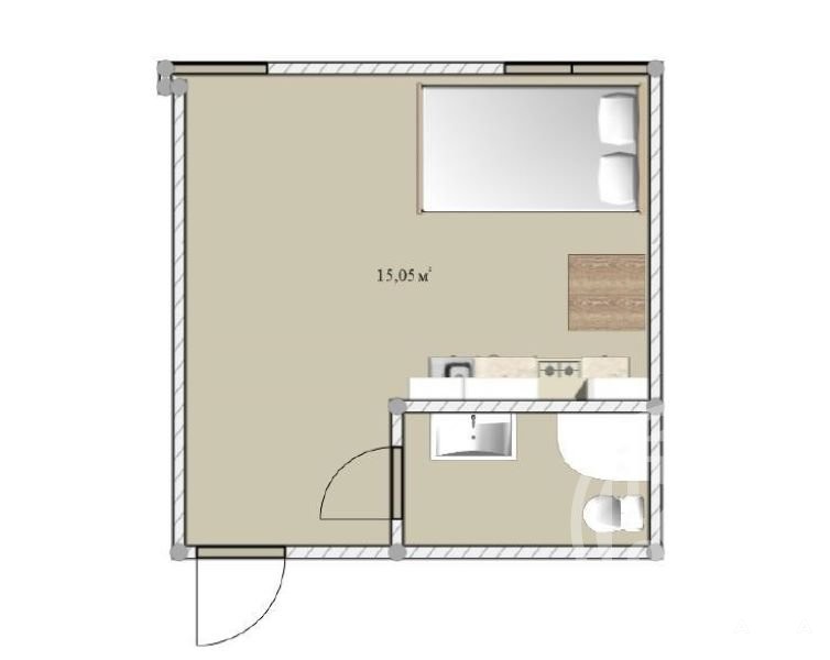 Студия расположена на 1 этаже пятиэтажного дома. Окна выходят во двор. Оснащена необходимой мебелью и техникой: кухонный гарнитур, холодильник, стиральная машина, кровать, стол, шкаф.
