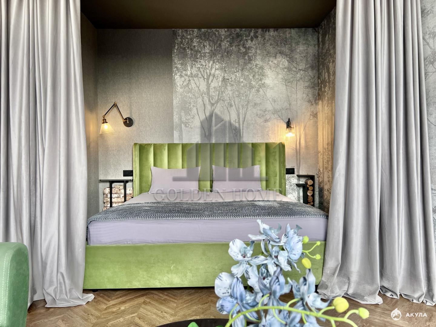 В зоне алькова особый уют создает красавица кровать евро макси размера с велюровой, сочной обивкой, ортопедическим матрасом, гипоаллергенными подушками и шелковистым постельным бельем. А так же заботящиеся о вашем глубоком сне бархатные шторы, удобные светильники с лампами Эдисона и прикроватные полки-мини дровницы, подчеркивающие экологичность интерьера и близость Юнтоловского заповедника.