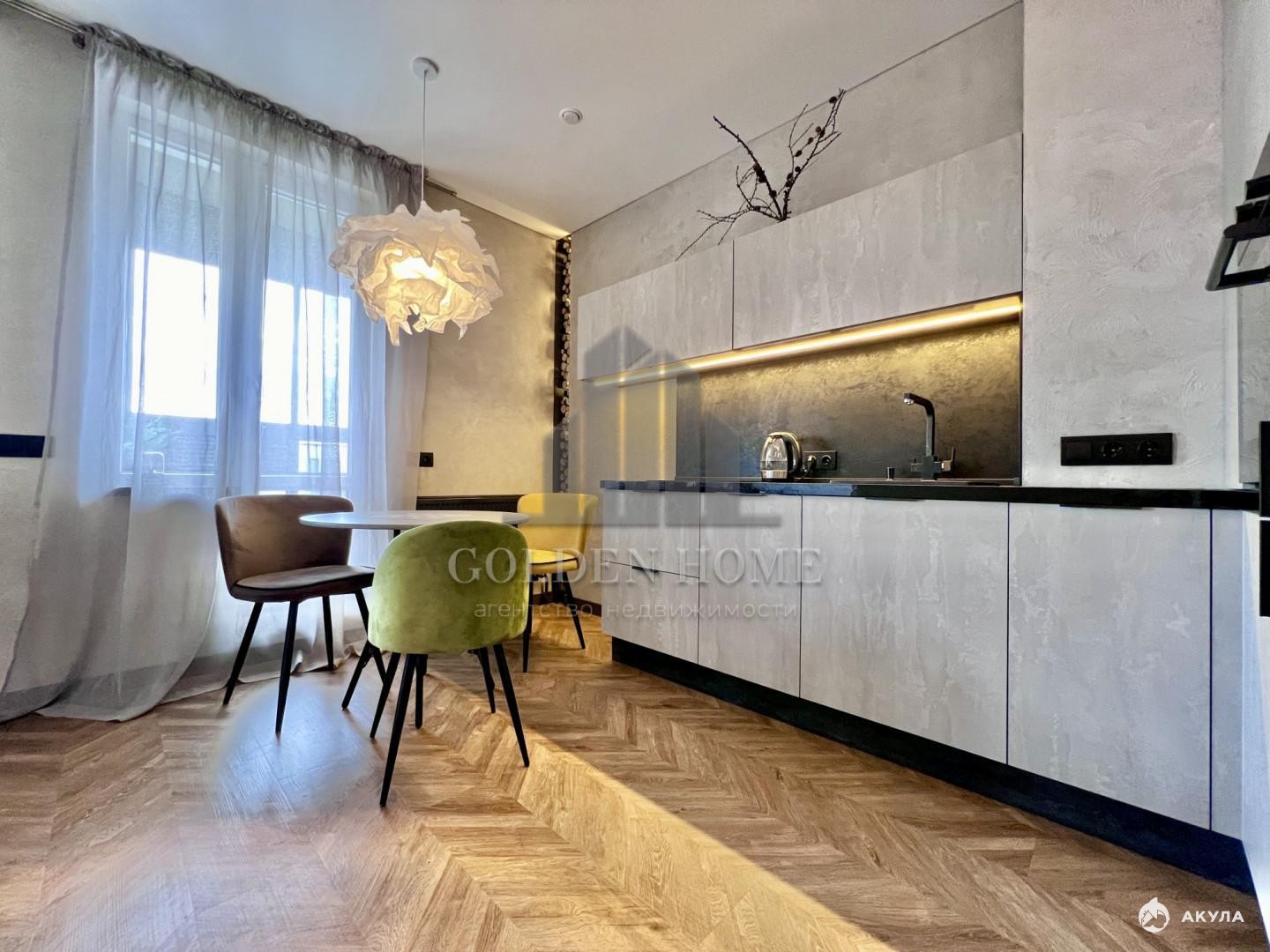 Кухня оснащена всем необходимым, а именно духовым шкафом, варочной поверхностью, большим холодильником, электрочайником, френч прессом, бокалами для вина, шампанского и воды, стильной посудой и столовыми приборами на 6 персон, что позволит вам не только комфортно готовить, но и получать эстетическое удовольствие от приема пищи, сидя за элегантным столиком в удобных бархатных креслах-стульях.