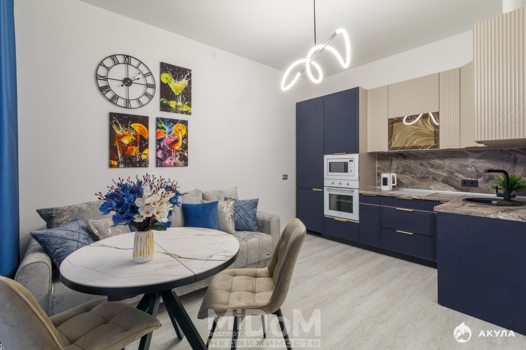 -В зоне гостиной расположен практичный и удобный раскладной диван, столовая группа и телевизор 55 дюймов.