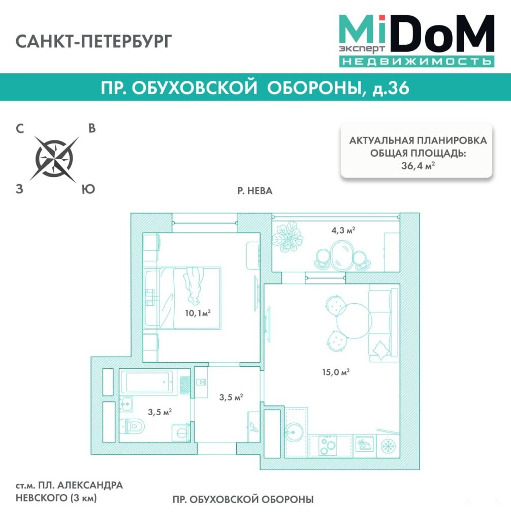 Площадь квaртиpы - 36, 4 кв.м.