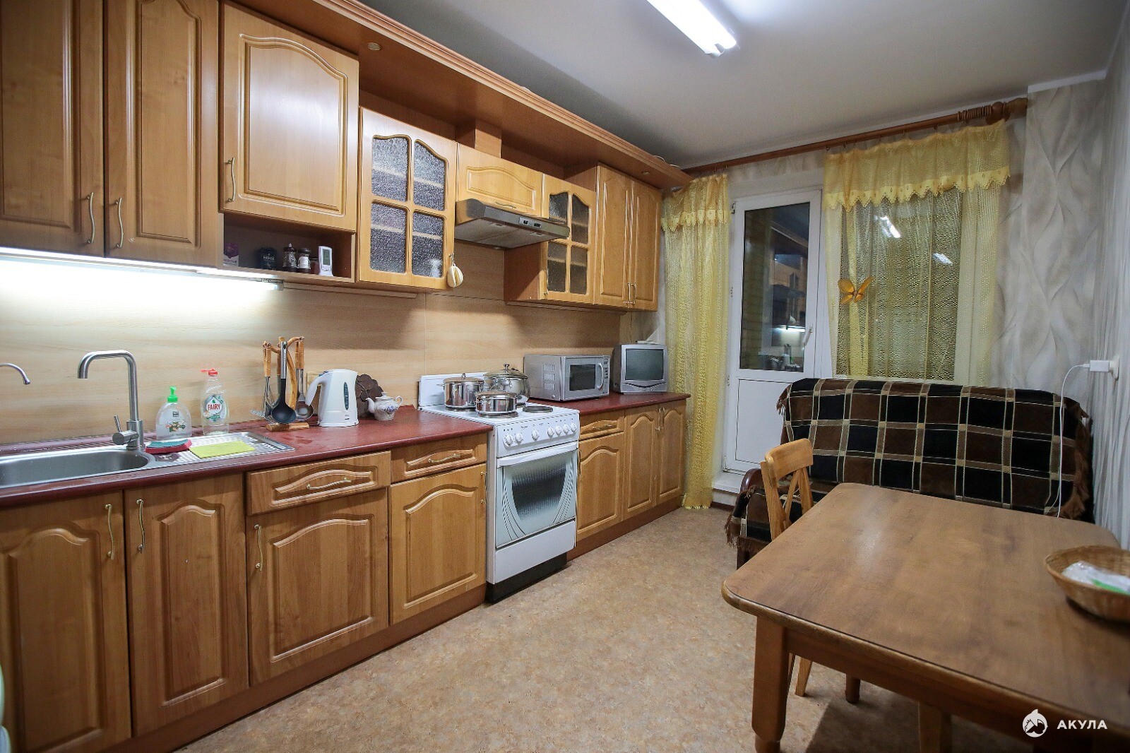 Квартира оборудована: Телевизор 40", микроволновка, телевизор маленький на кухне, плита 4х конфорки, вытяжка мощная, холодильник Атлант, морозильная камера Атлант, электрический чайник, стиральная машина.