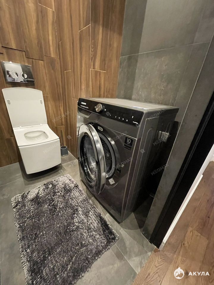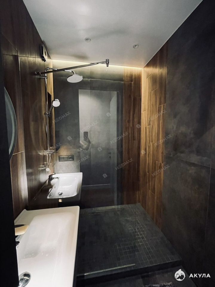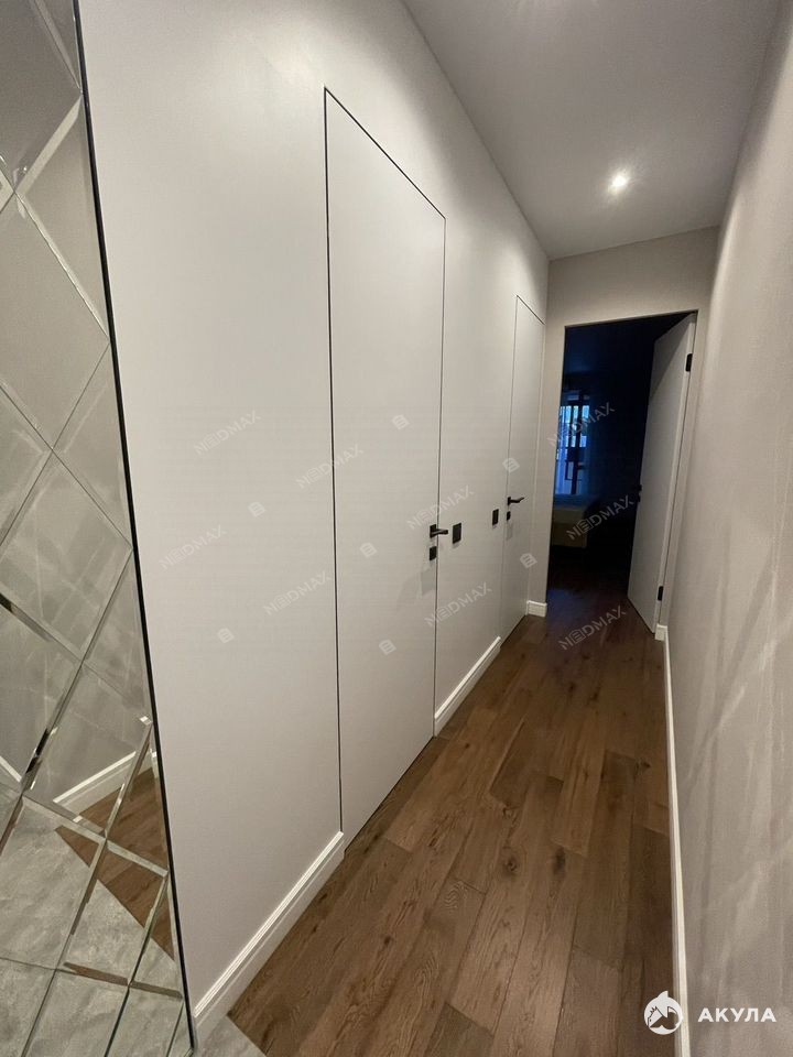 Входные и межкомнатные двери высотой 2200 мм, скрытого монтажа (фурнитура Morelli), подчеркивают насыщенный и современный стиль. Высококлассный паркет из дуба, керамогранит на полу и на балконе — натуральная террасная доска. Кухня IKEA с фасадами из Италии оснащена индукционной варочной поверхностью, встраиваемой посудомоечной машиной Electrolux, духовым шкафом и мощной вытяжкой. В санузле — плитка из Испании и стиральная машина Samsung.