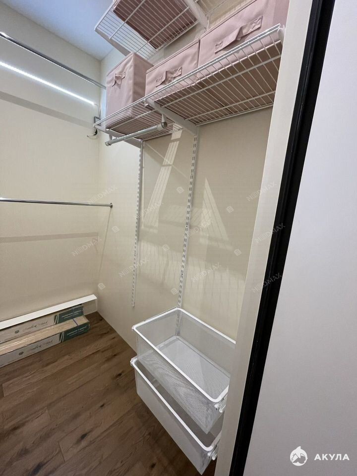В спальне установлен мощный кондиционер Haier и стильные блэкаут шторы по всему жилью. Спальное место — кровать Askona 180 с комфортным матрасом на независимом пружинном блоке. Для гостей — раскладывающийся диван с пружинным блоком в кухне-гостиной. Отдельный гардероб с подсветкой и комод обеспечат удобство хранения.