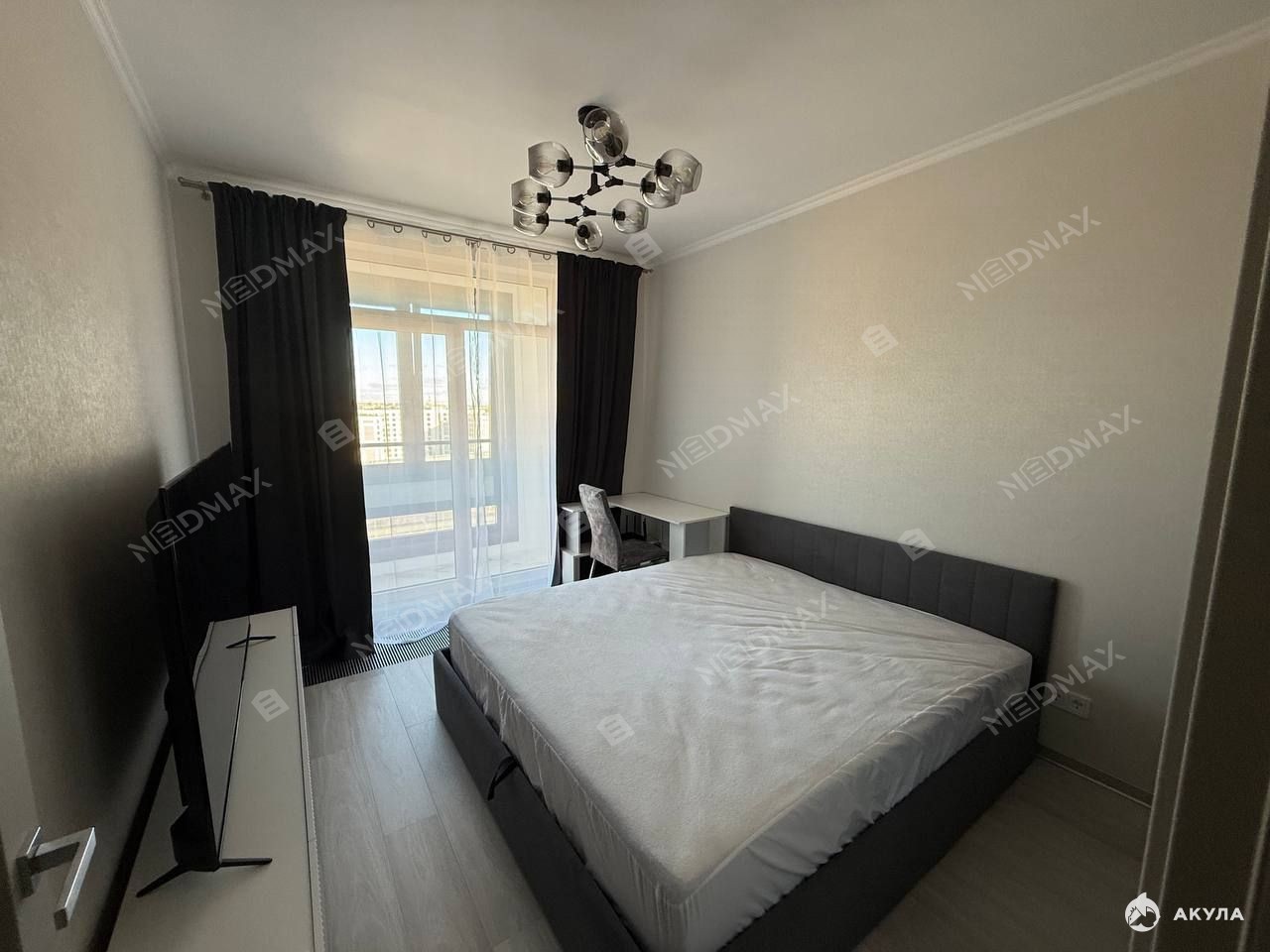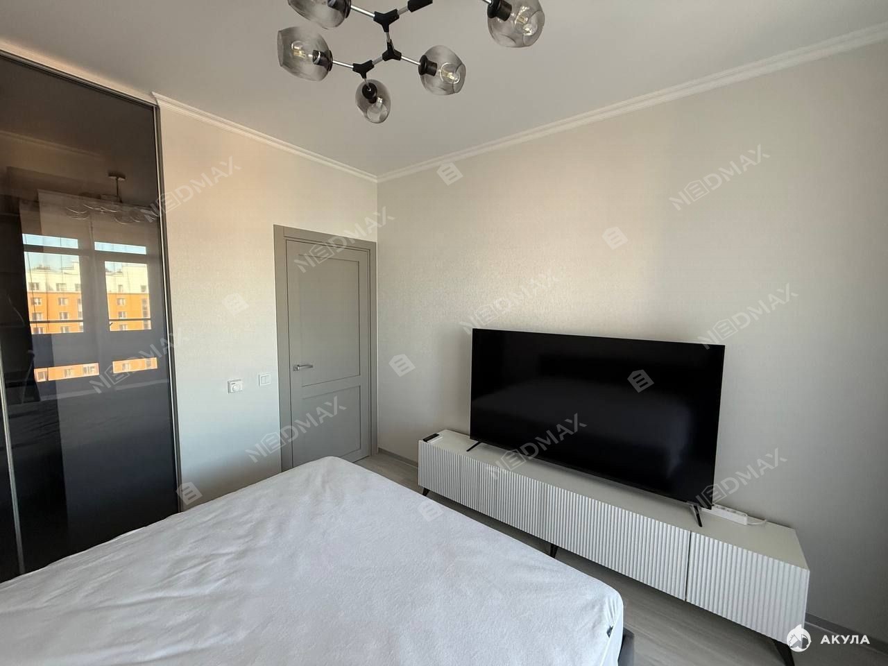 Спальня-убежище: Просторная кровать 180x200 см, умный телевизор и отдельная гардеробная создают личное пространство для полного отдыха.