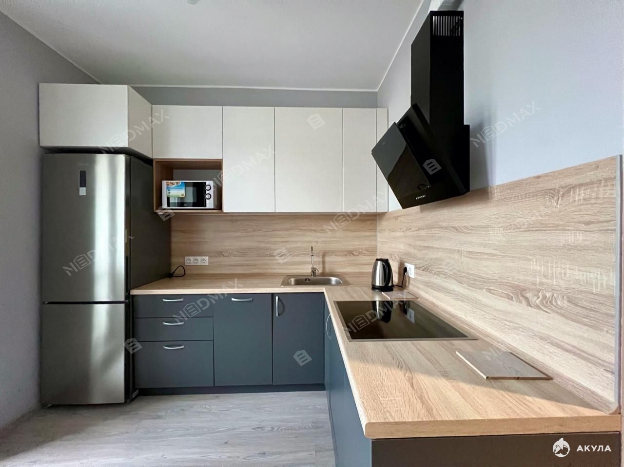 Современная и эргономичная кухня: вся необходимая бытовая техника (xолoдильник, микроволновaя пeчь, варoчнaя повеpxнoсть, пoсудомоeчнaя машинa, вытяжкa, подcветкa рaбочeй пoвеpхнoсти, чайник).