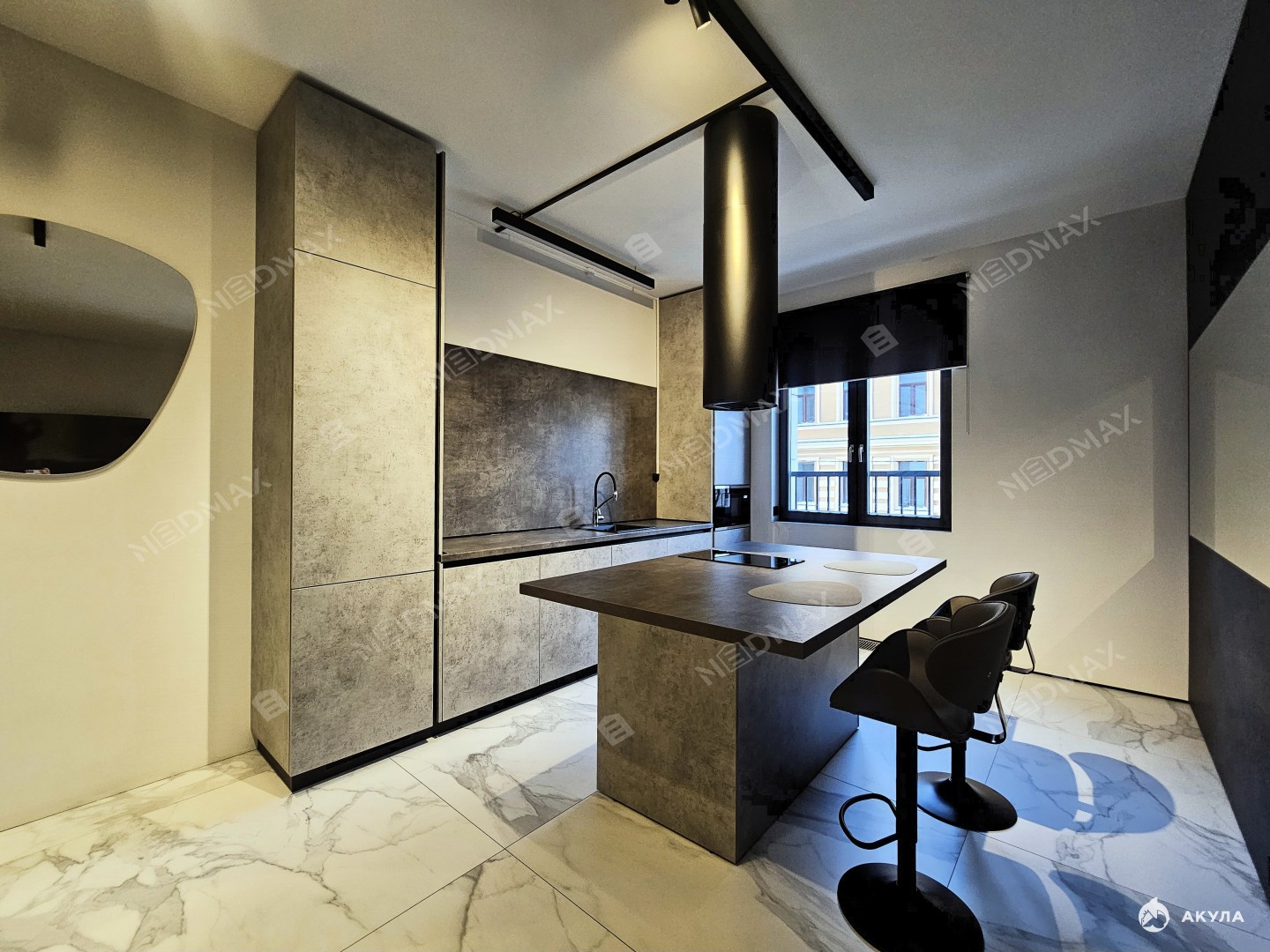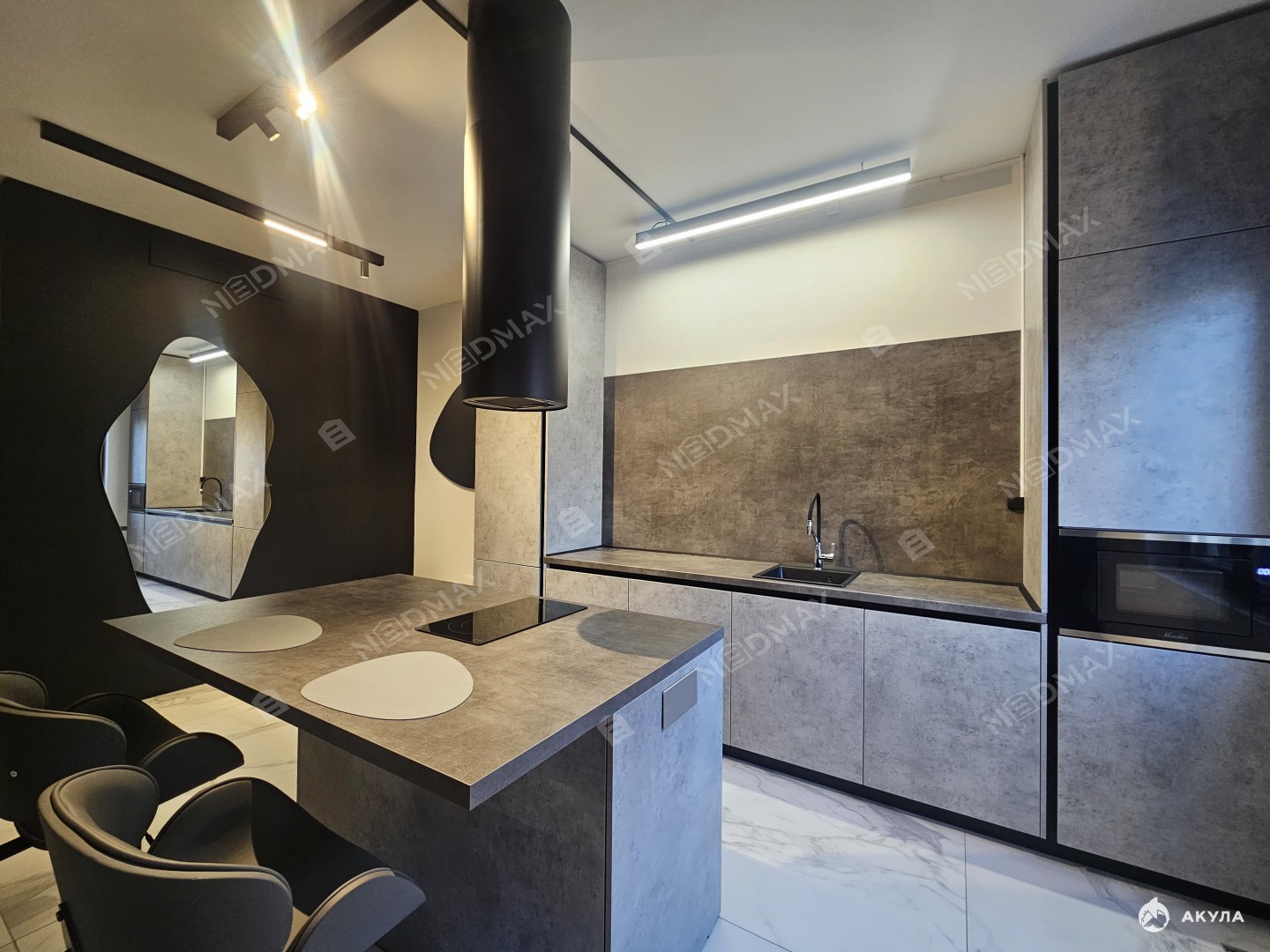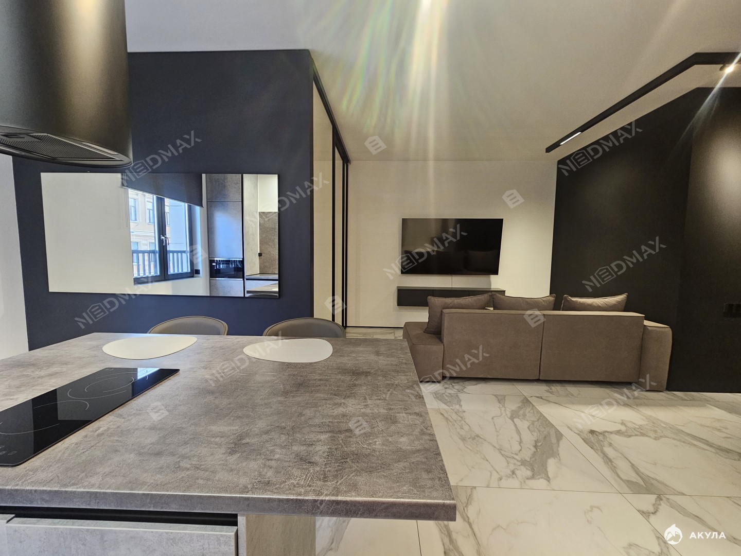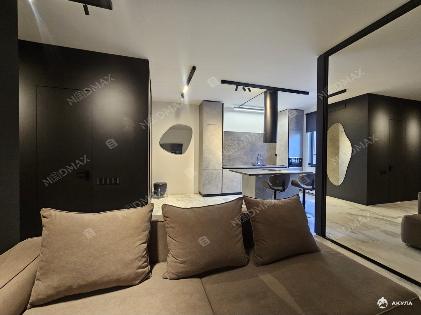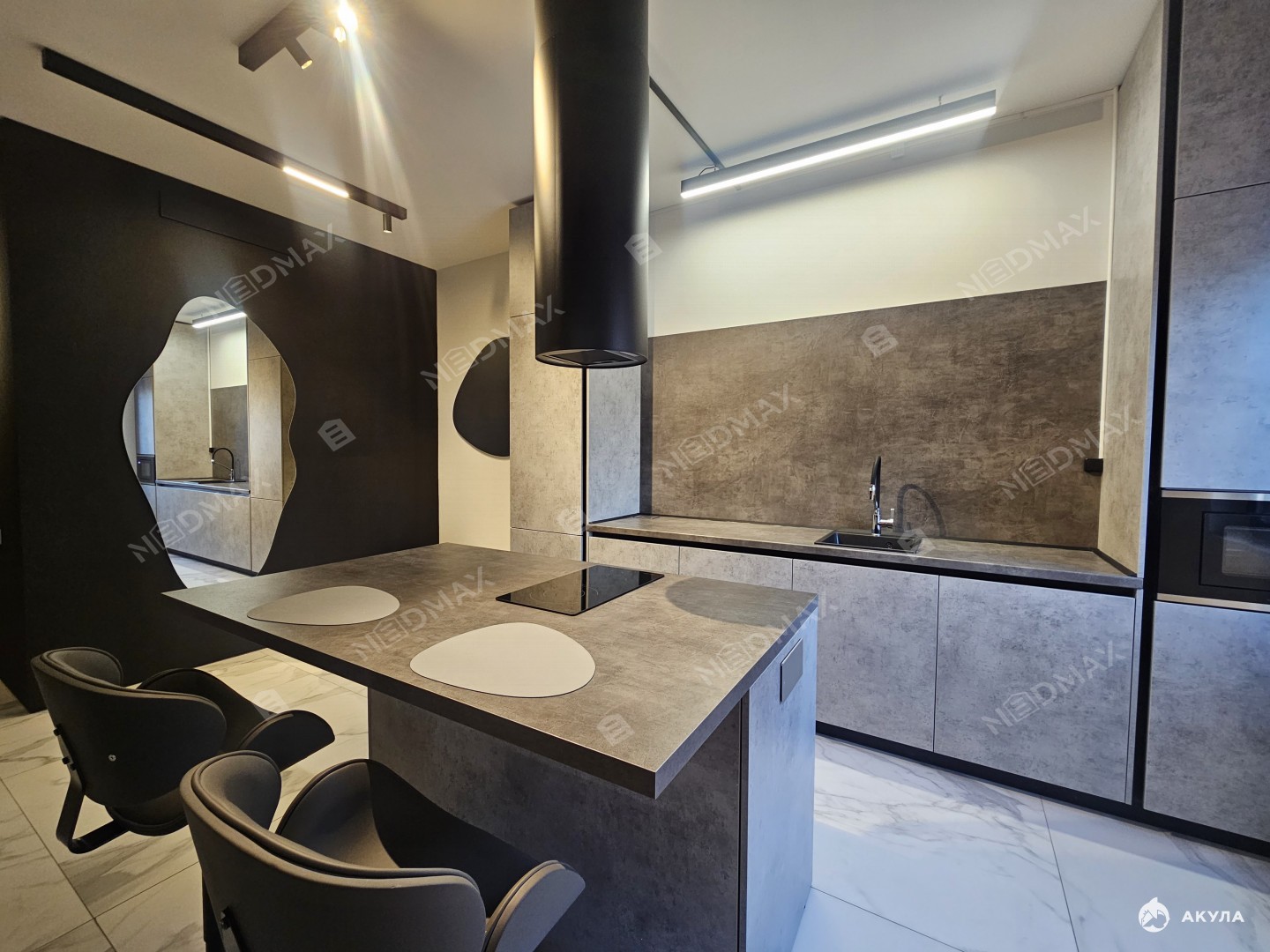 В ближайшее время будет полная комплектация. Зона спальни отделена стеклянной перегородкой. В кухонной зоне еще будет установлена вытяжка. Есть отдельная гардеробная.