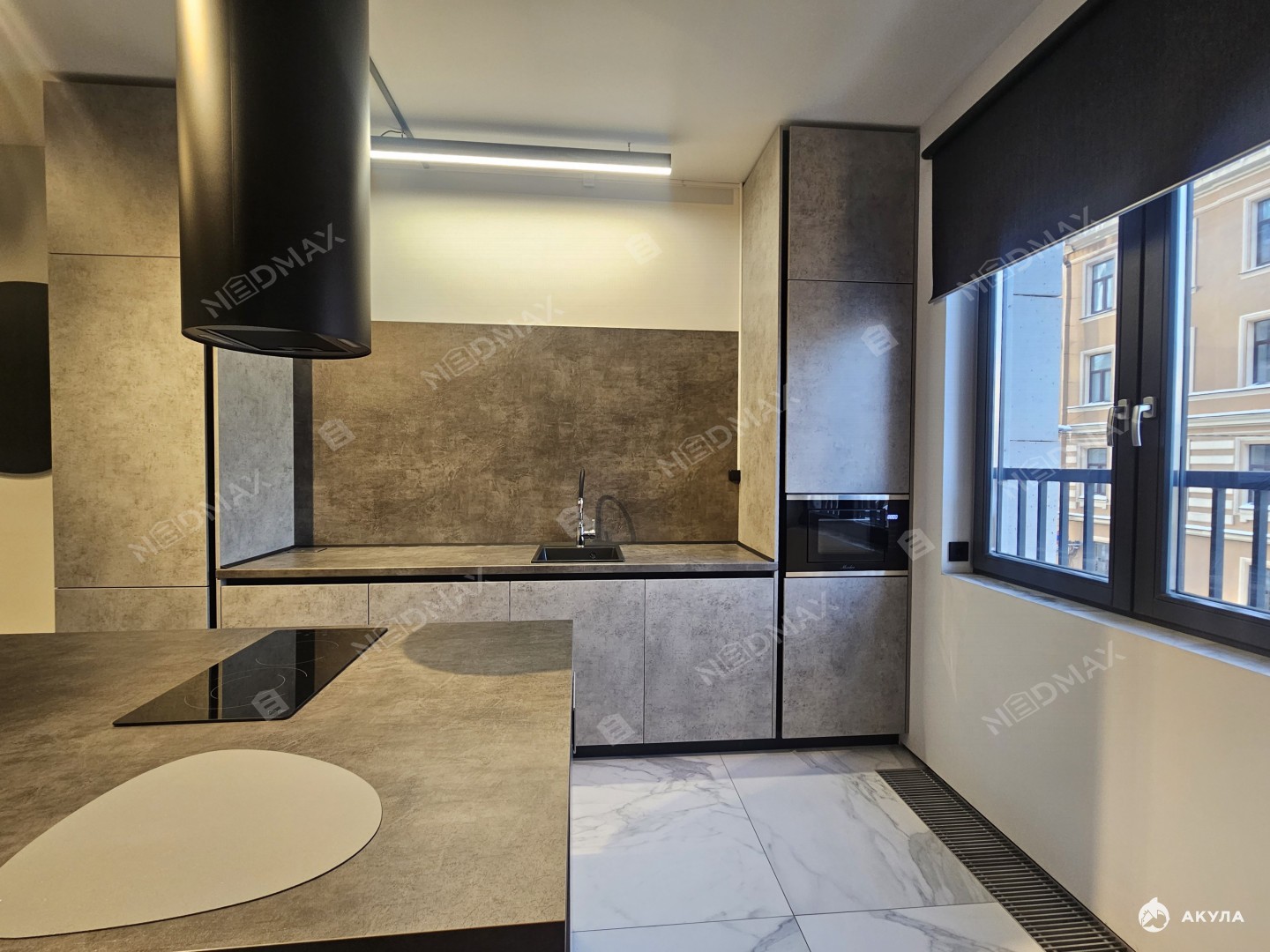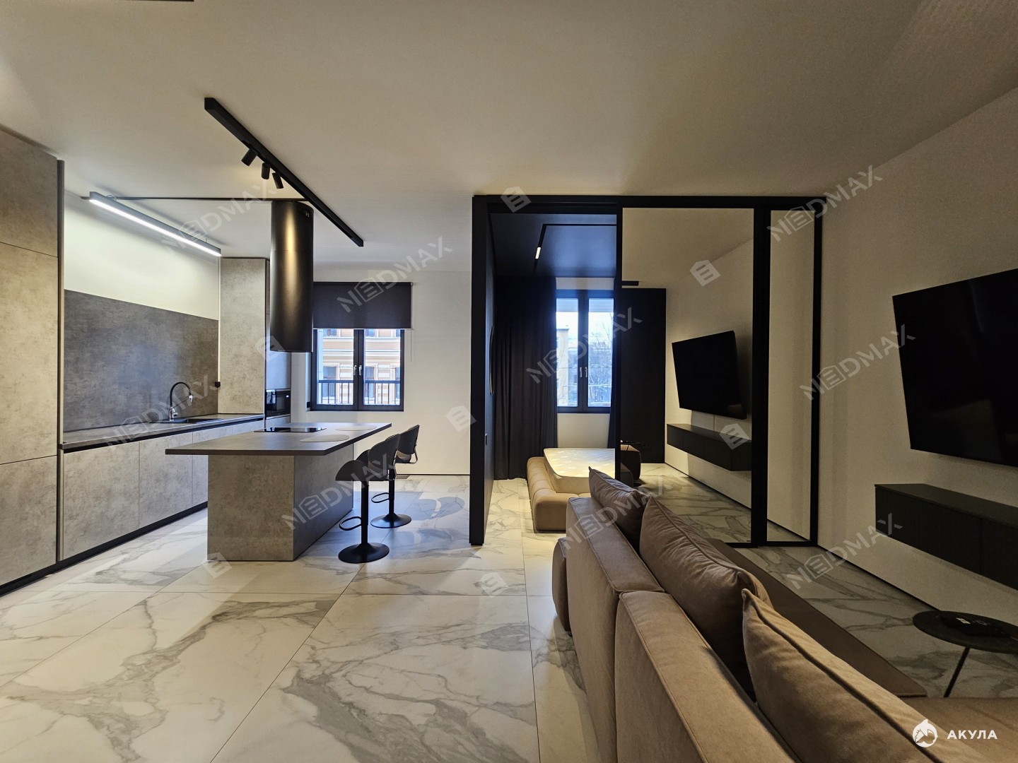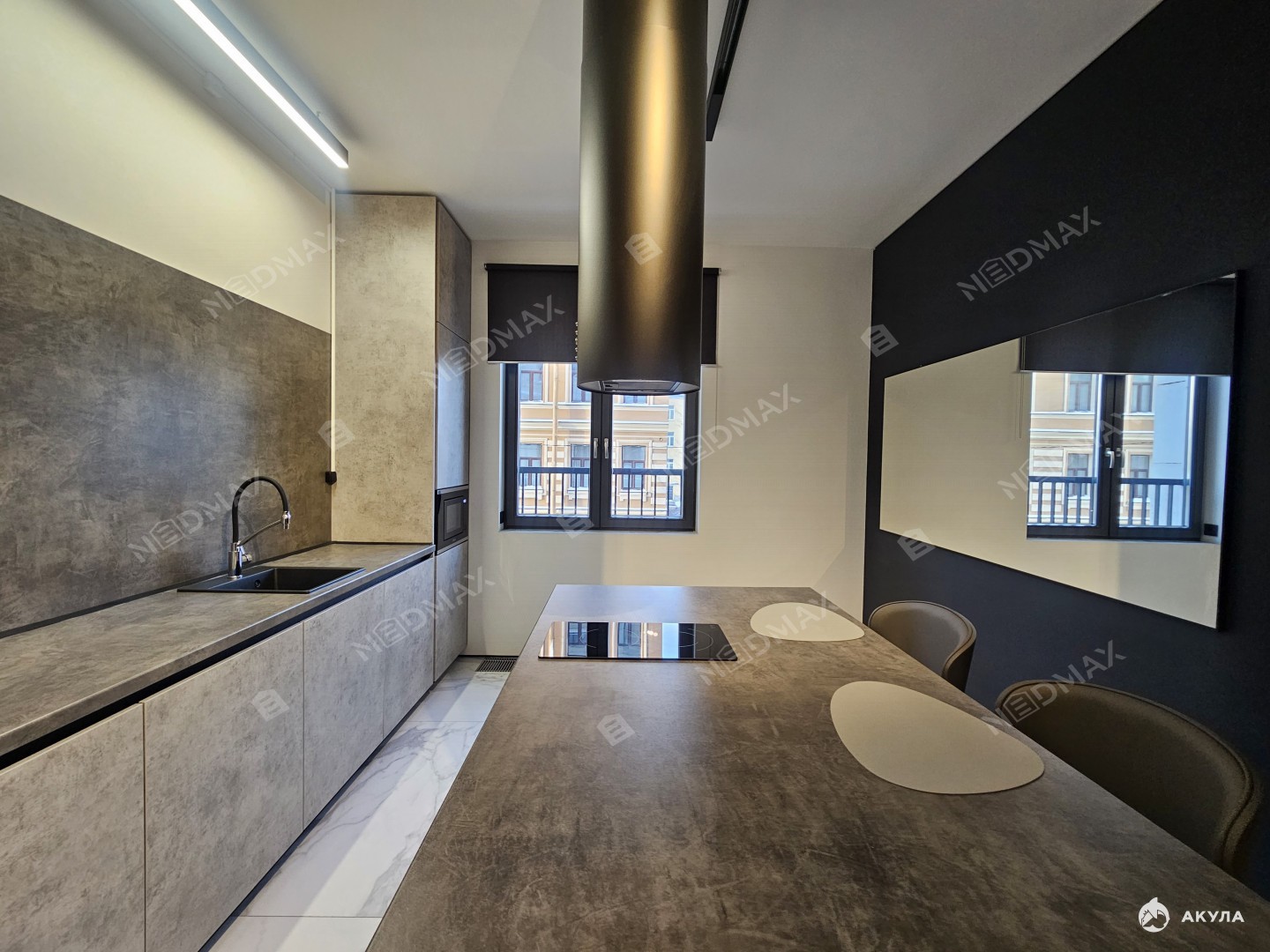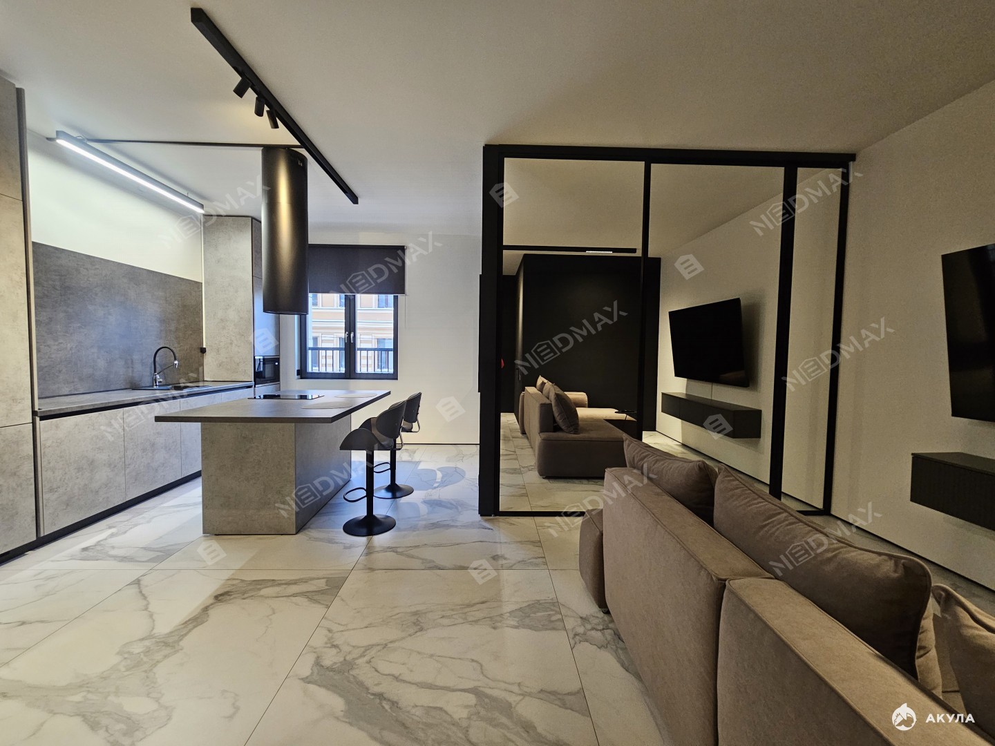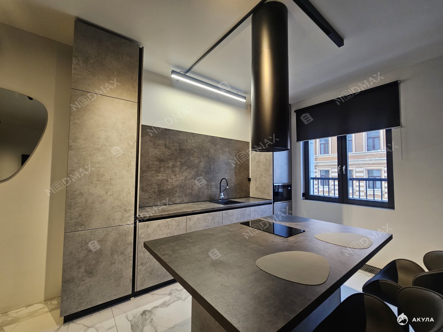 В ближайшее время будет полная комплектация. Зона спальни отделена стеклянной перегородкой. В кухонной зоне еще будет установлена вытяжка. Есть отдельная гардеробная.