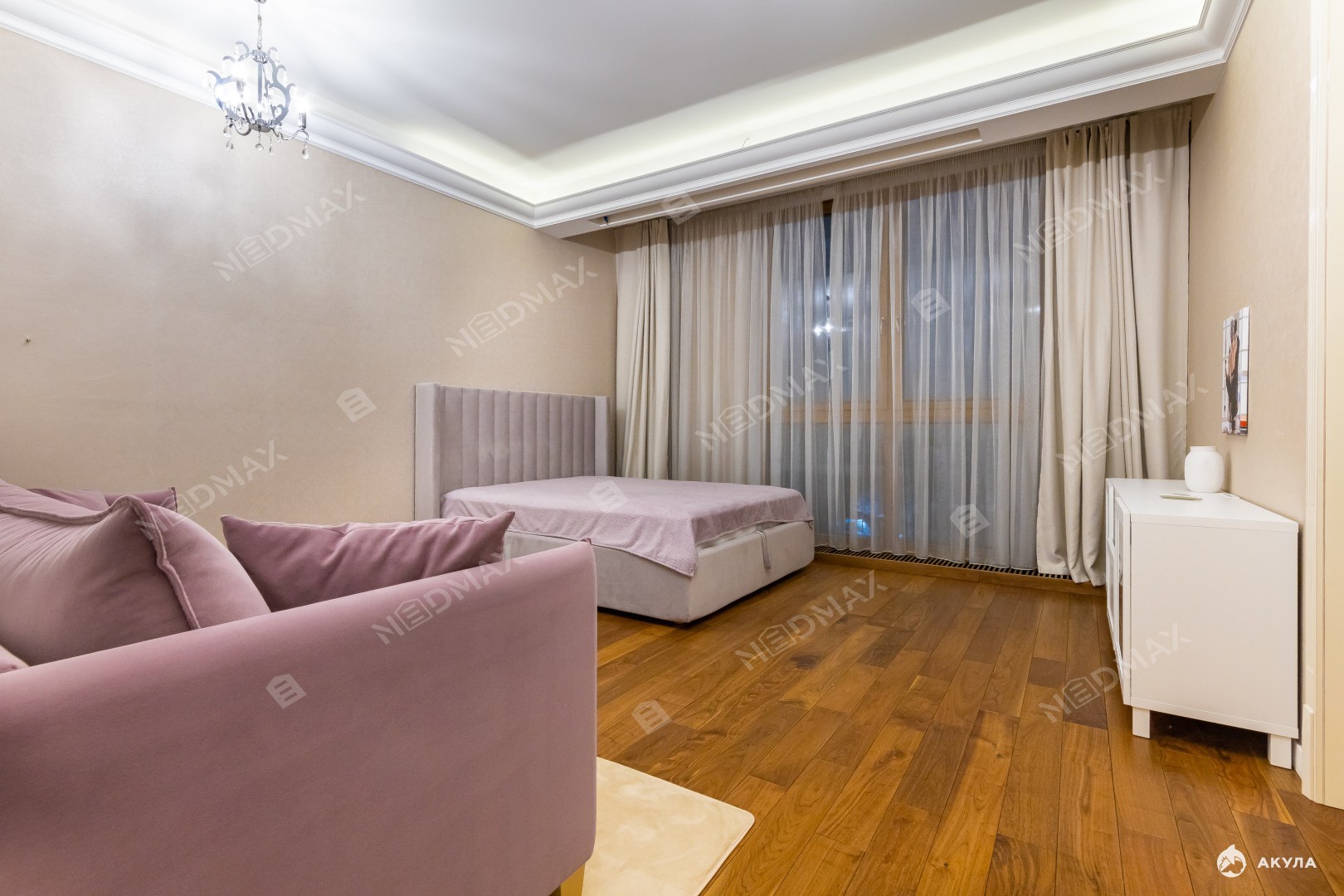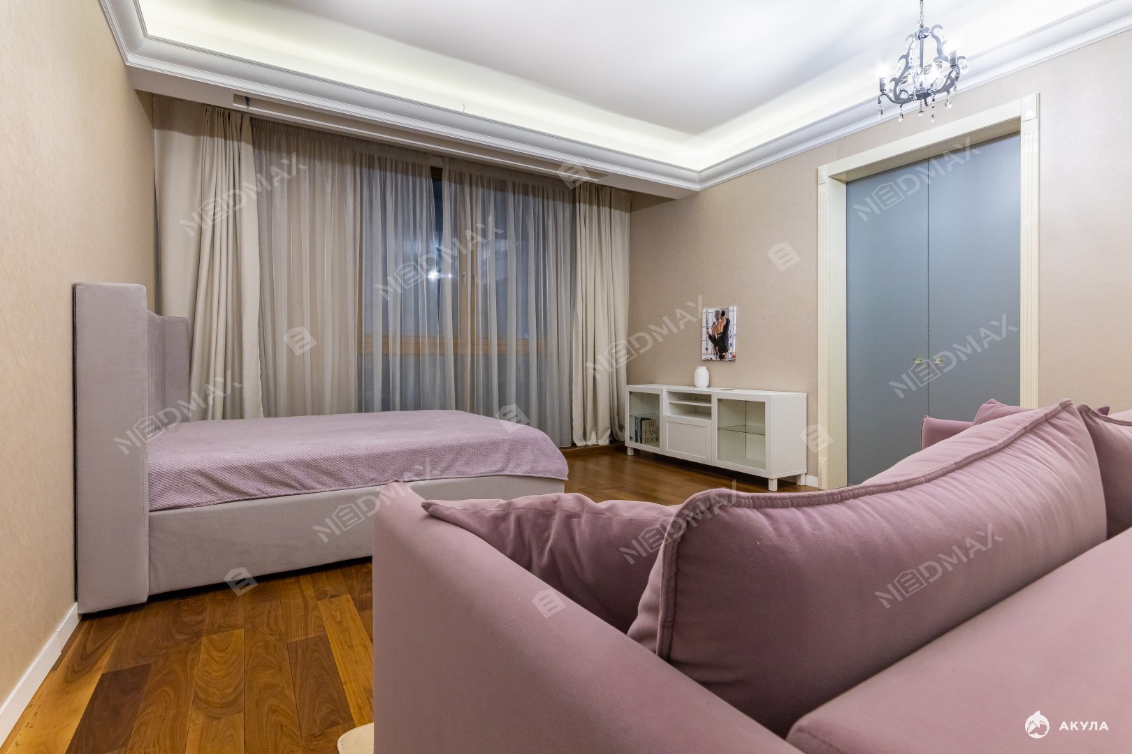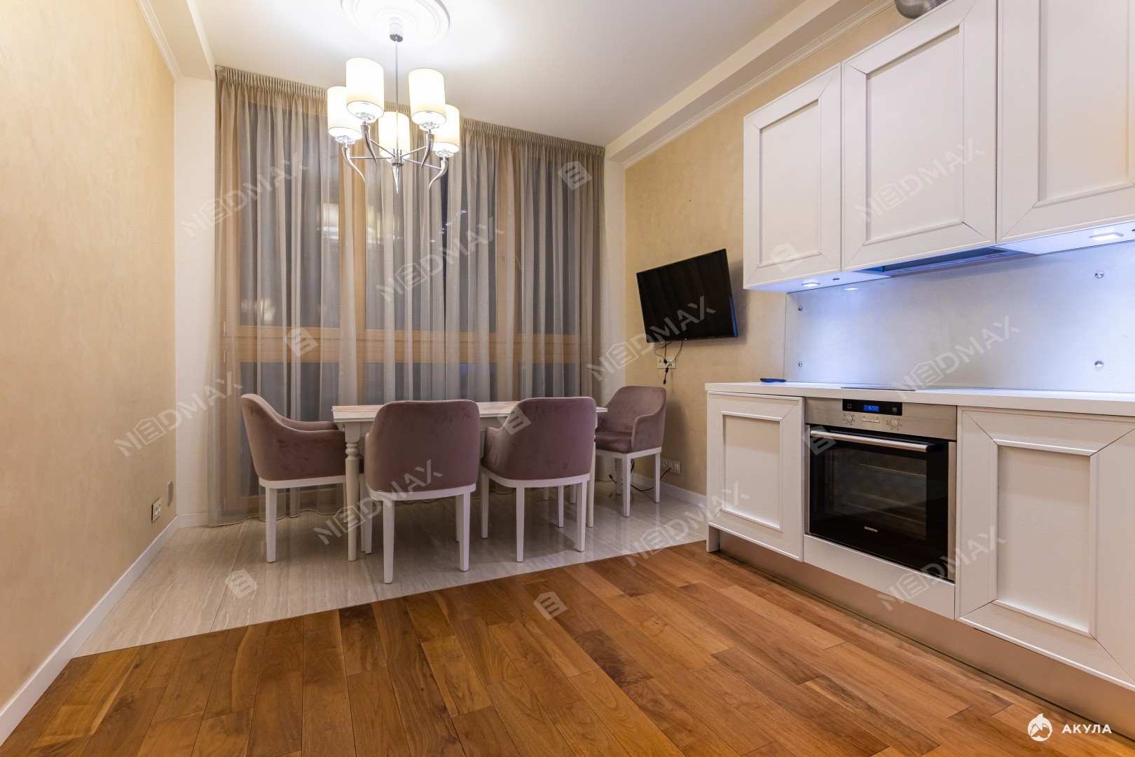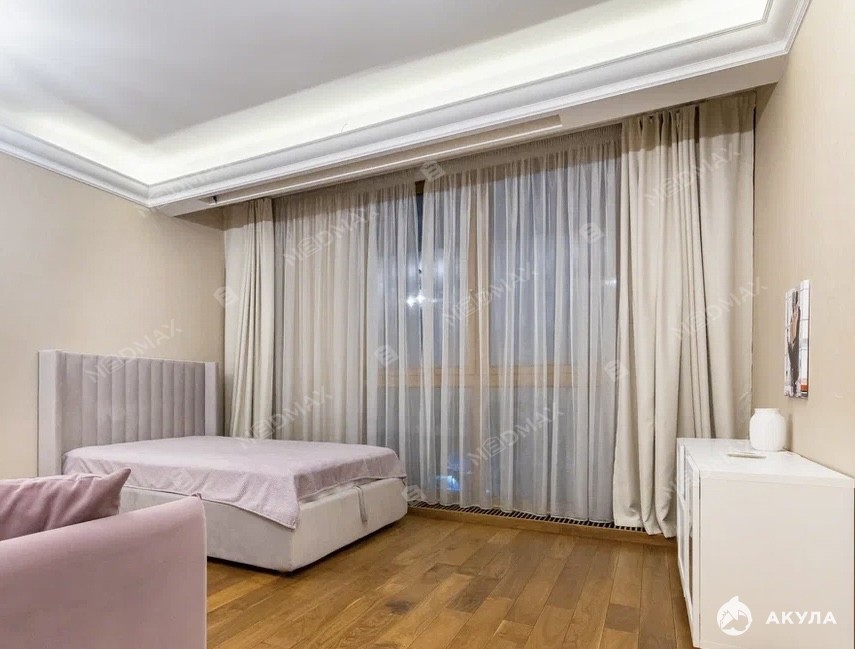 В квартире выполнен качественный евроремонт с использованием дорогих отделочных материалов. Планировка - спальная комната, просторная оборудованная кухня (посуд.машина), санузел с душевой, балкон. Много мест для хранения. Комфортабельная мебель, современная техника. Кондиционер, бойлер, вентилируемые фасады. Высокие потолки 3, 1 м с окнами в пол.