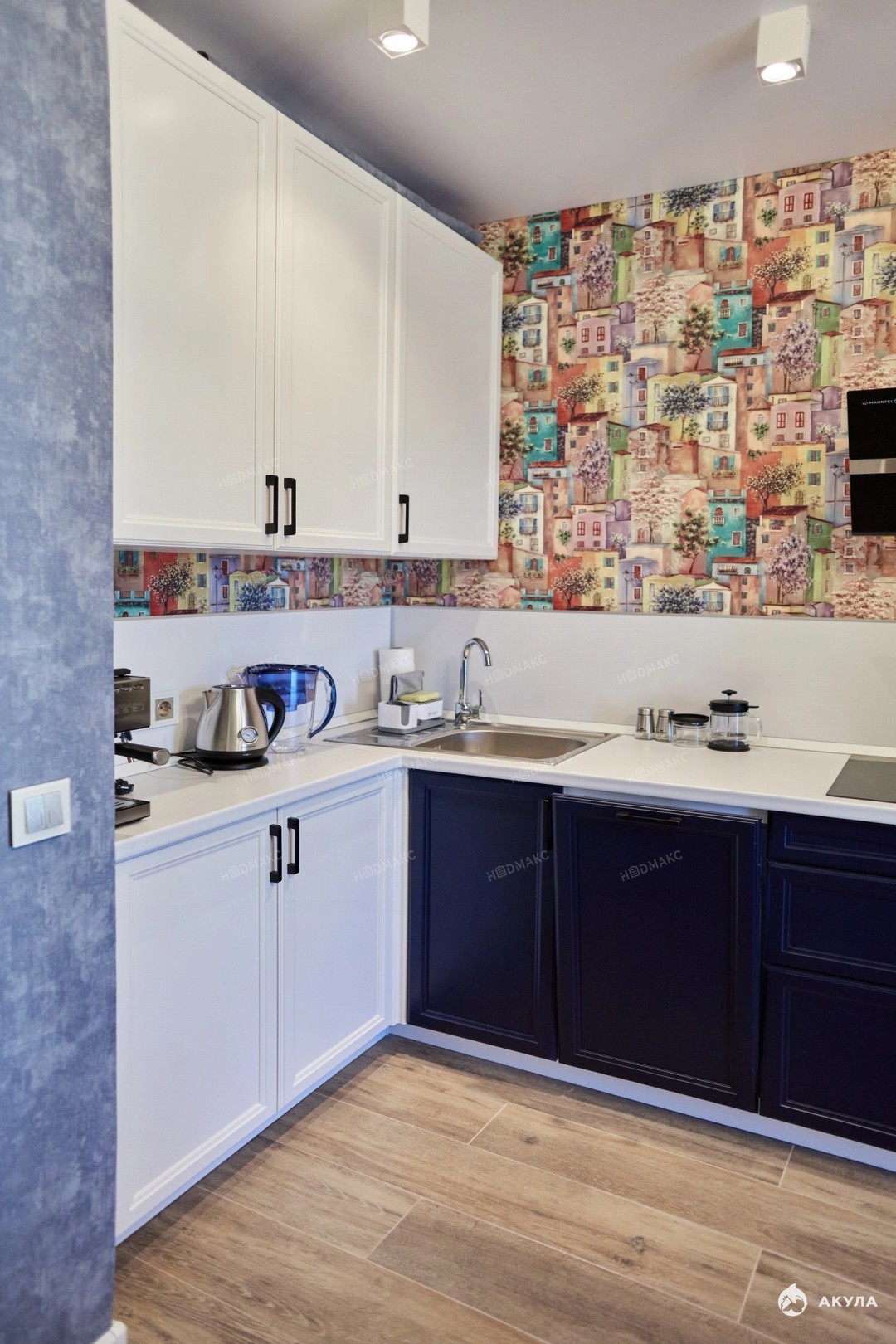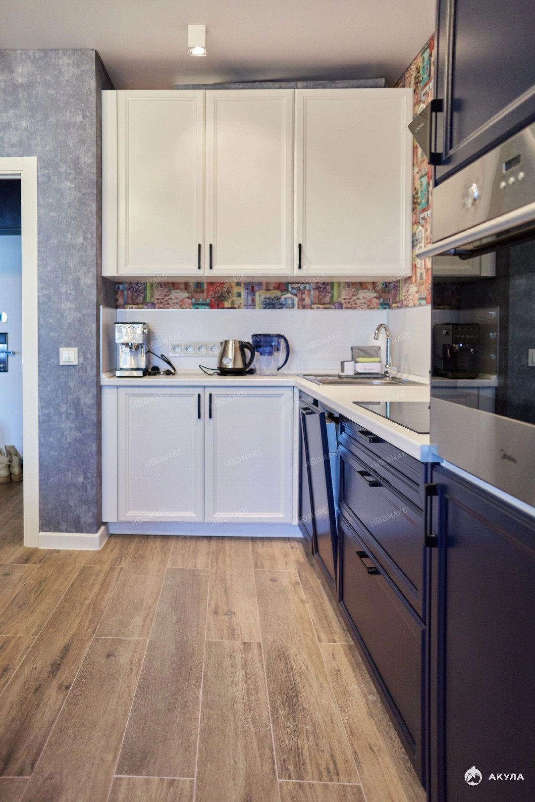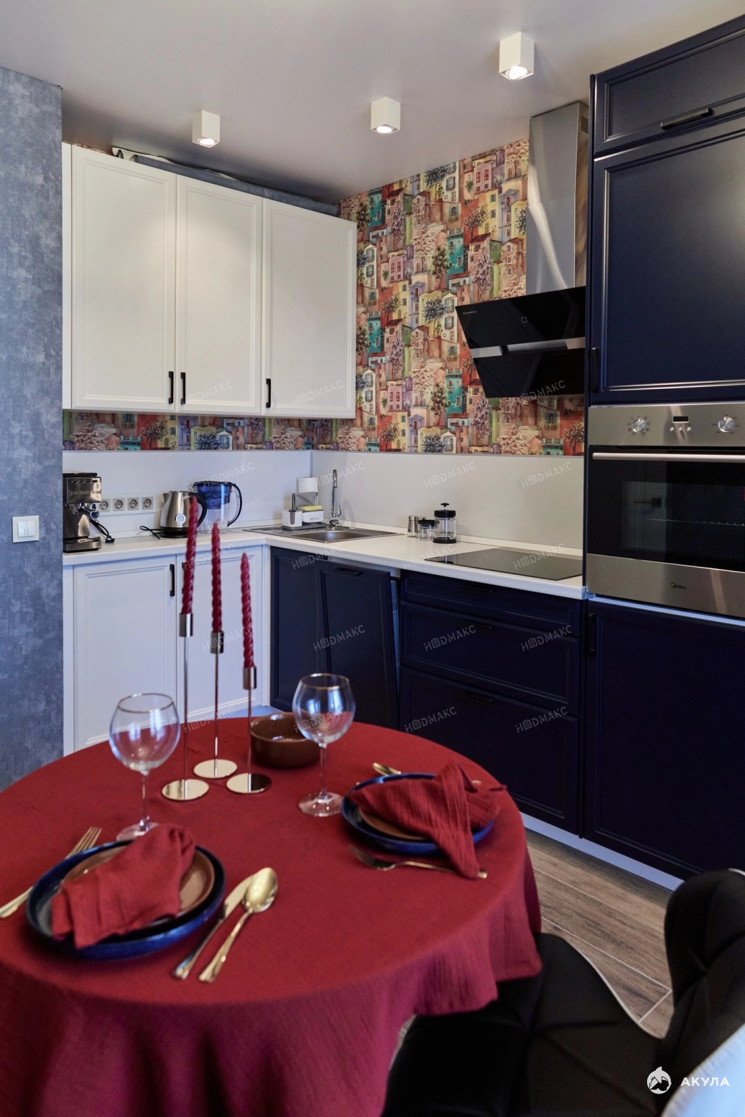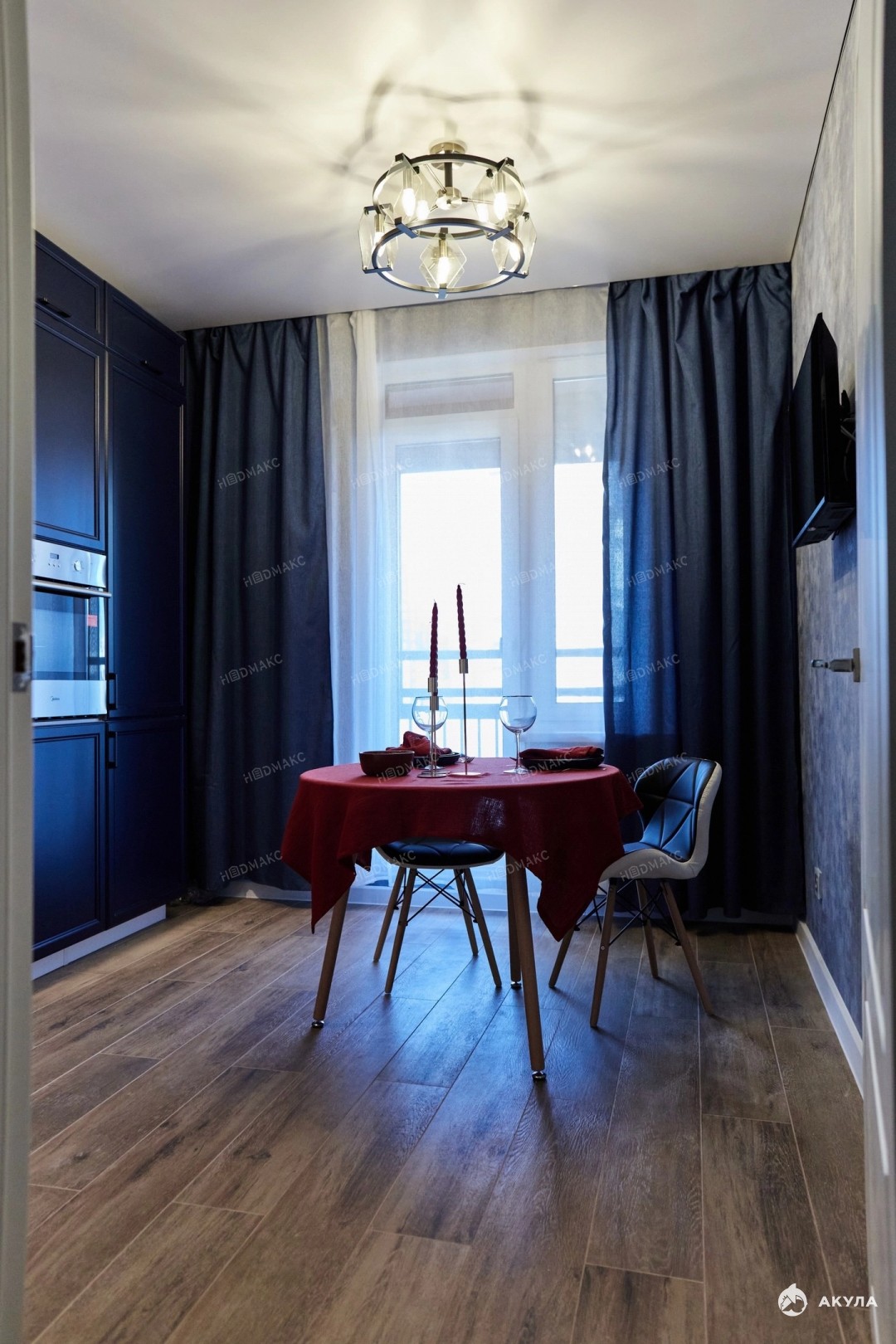 • Полностью оборудованная кухня с техникой: стиральной и посудомоечной машинами, духовым шкафом, варочной панелью и холодильником.