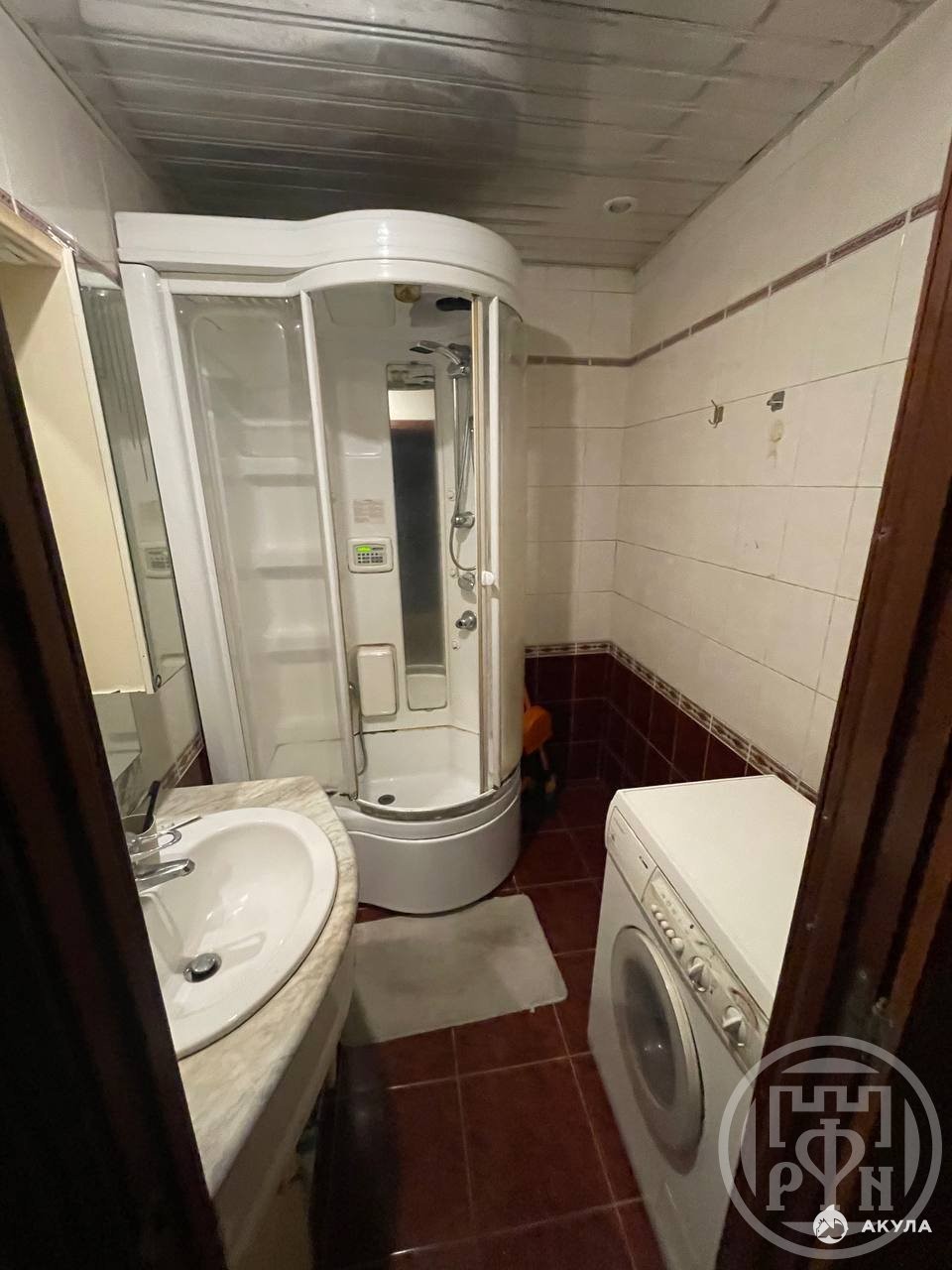 В ванной комнате — душевая кабина и стиральная машина.
