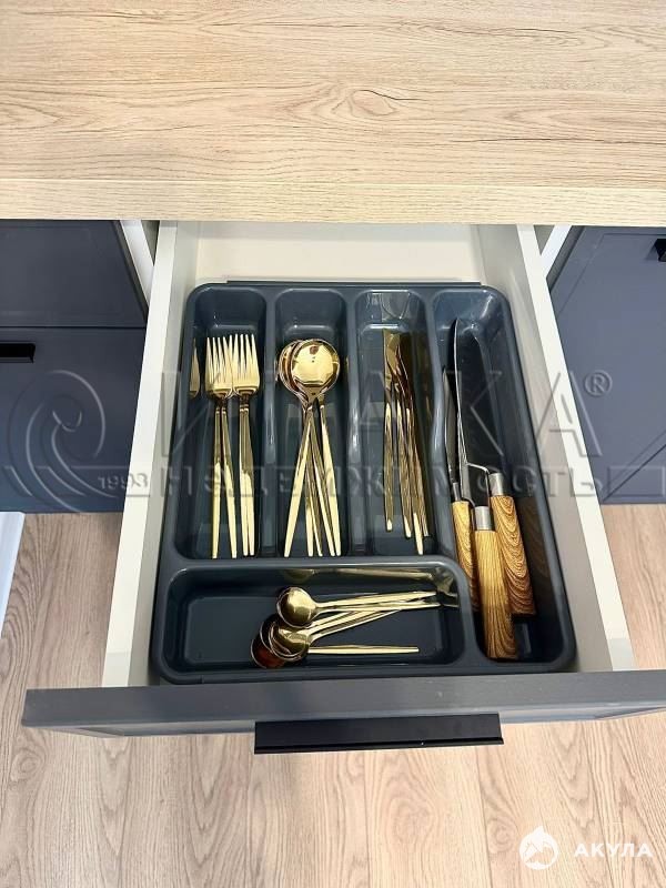 В кухне-гостиной установлен встроенный гарнитур. Из необходимого имеется: двухкамерный холодильник, чайник, микроволновка, посуда, столовые приборы.
