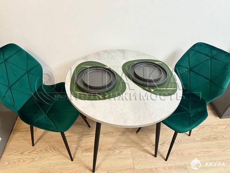 В зоне гостиной есть раскладной диван, комод, раскладной кухонный стол и стулья.