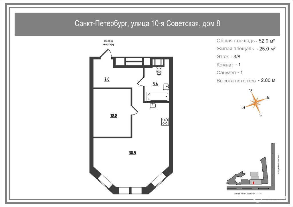 — общая площадь 52, 9 м², третий этаж из восьми;