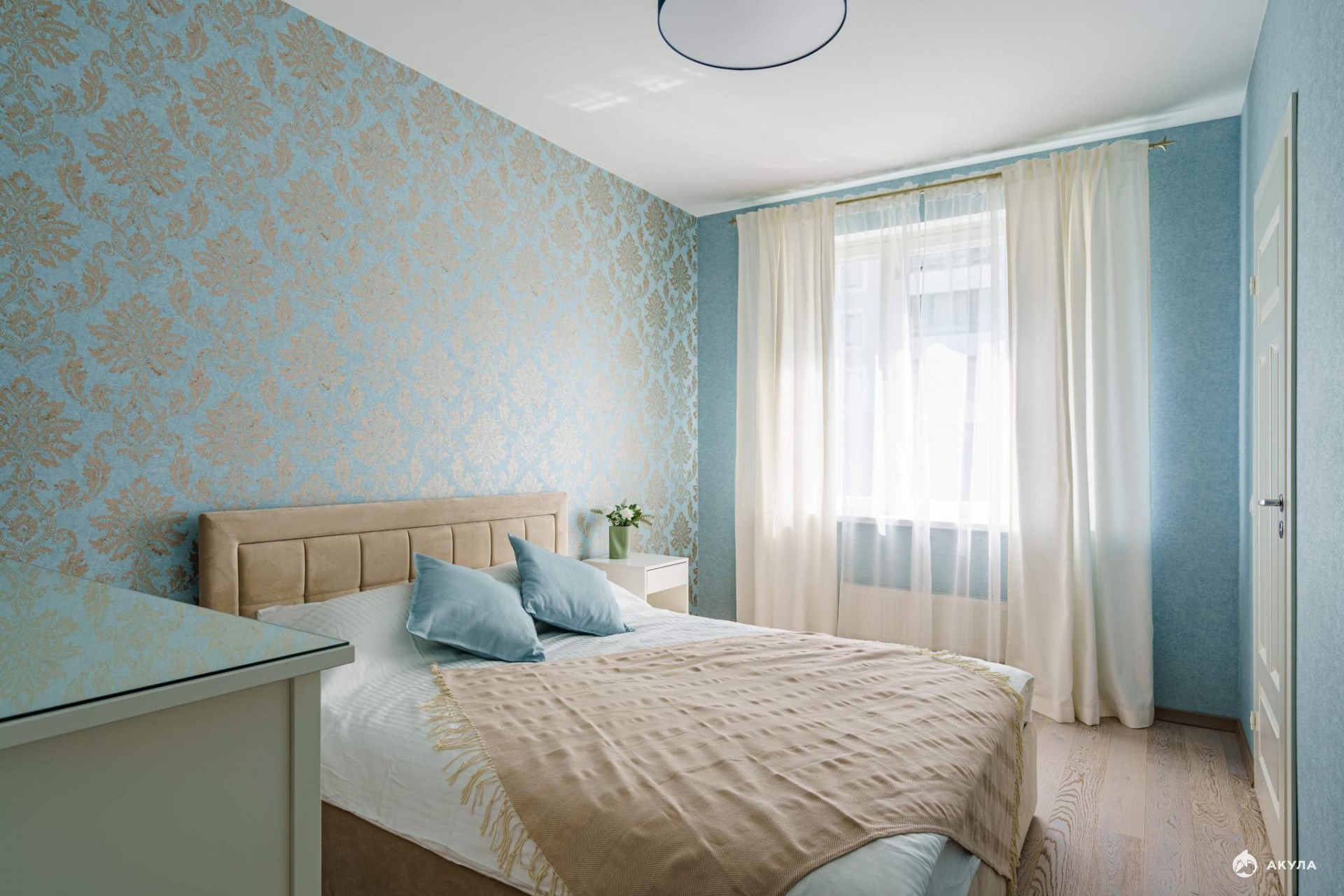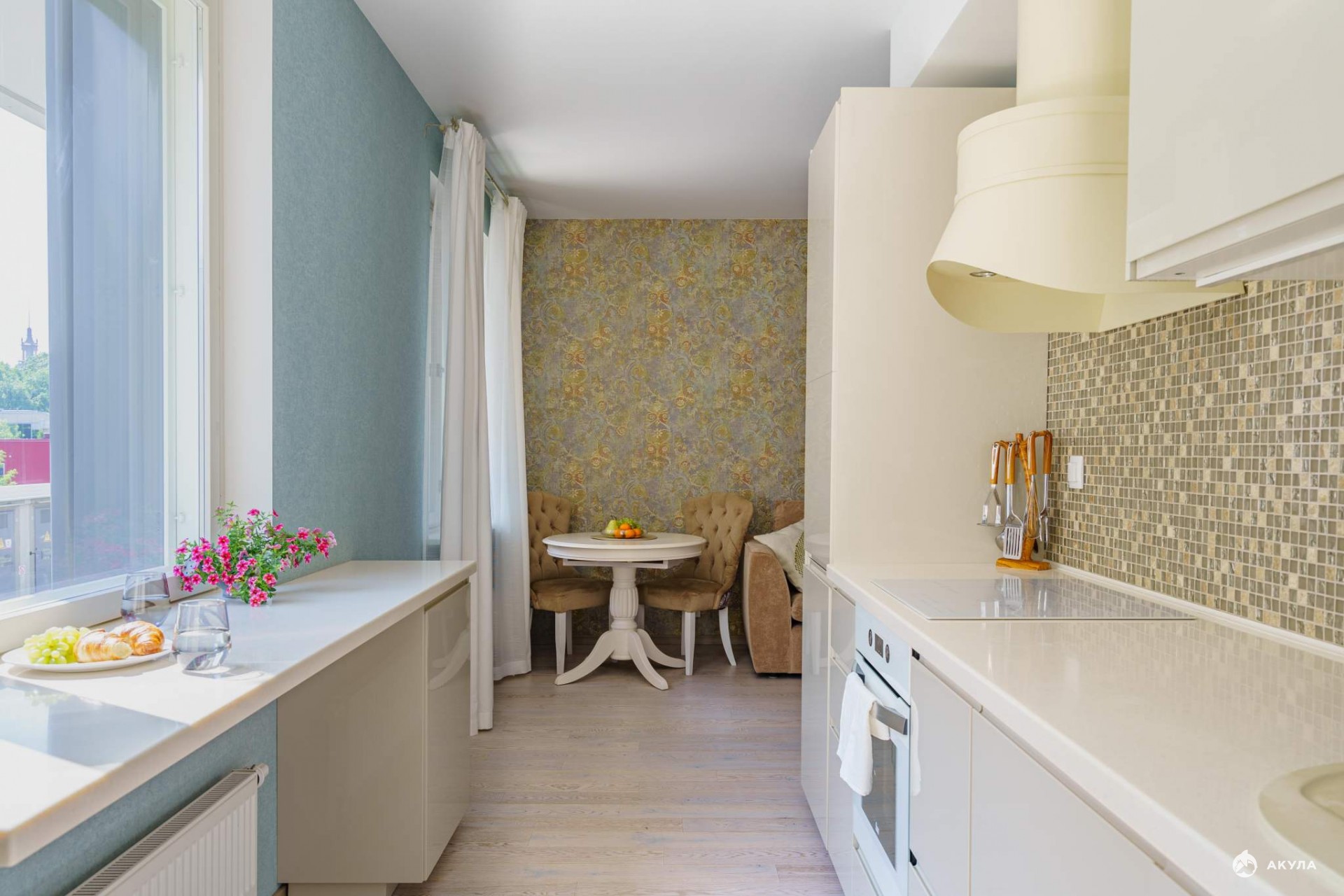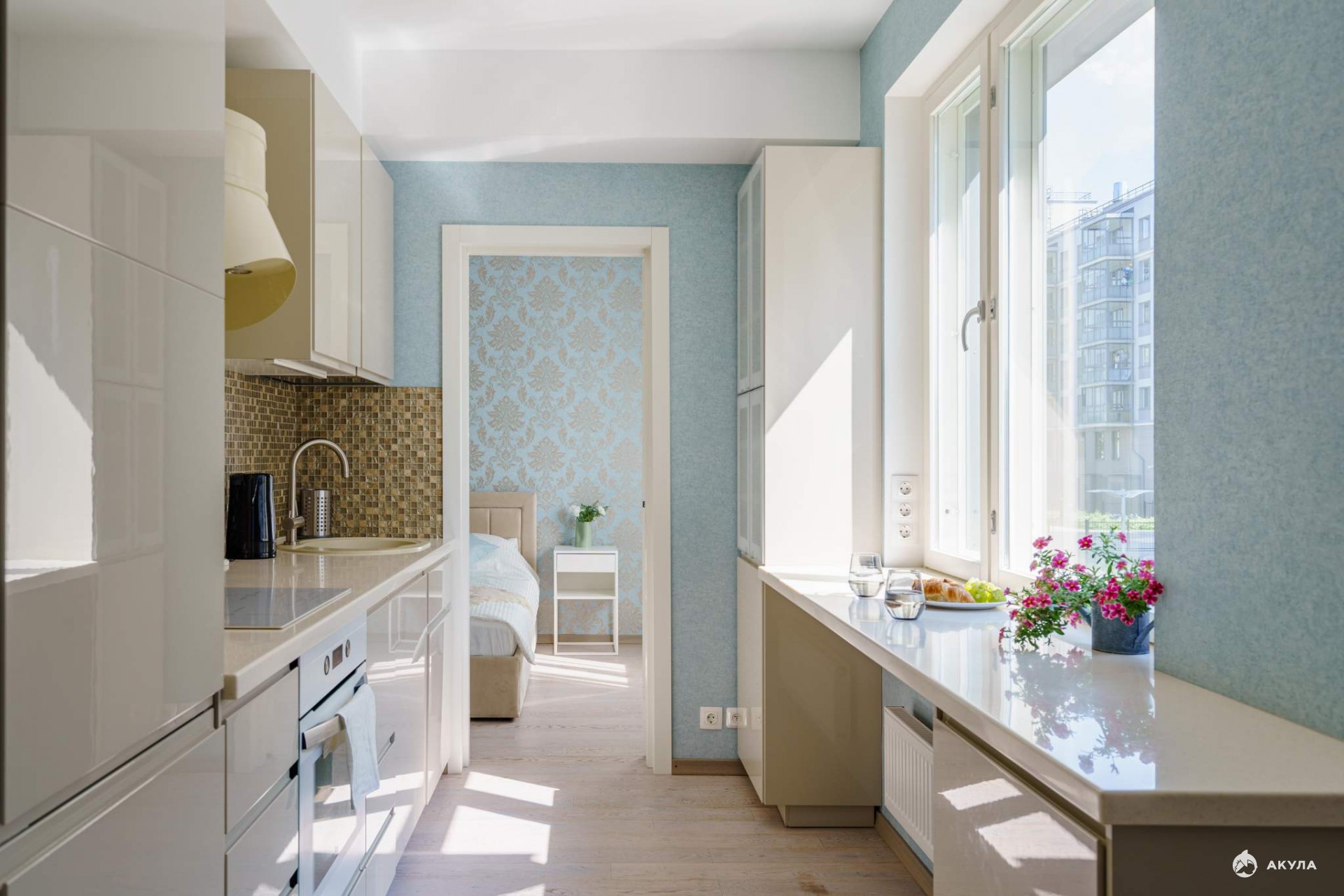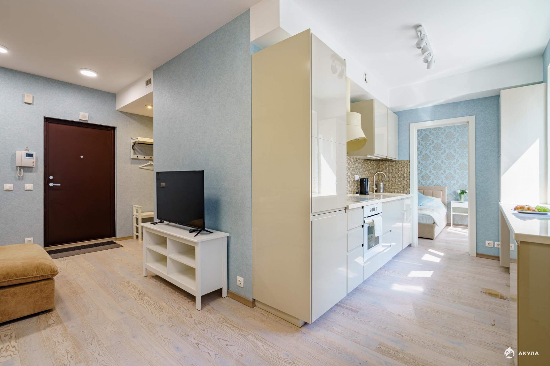 Удобная для жизни и всеми любимая круговая планировка: прихожая плавно перетекает в пространство кухни-гостиной, где уместились зоны готовки и отдыха, обеденный стол, объемные шкафы. Из кухни можно пройти в уединенную, отделенную от общего пространства, спальню.