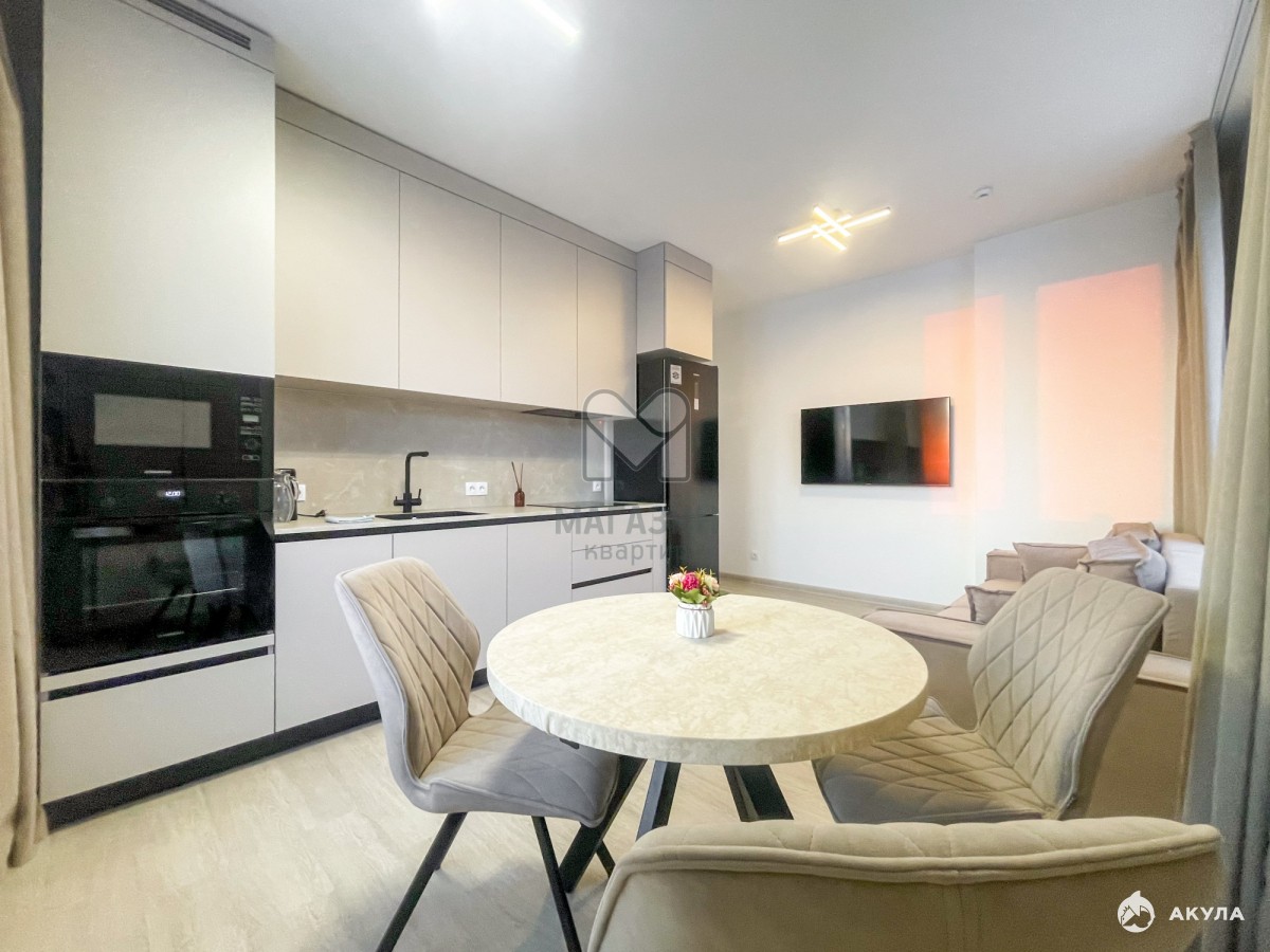 Полностью оборудованная кухня на заказ с подсветкой рабочей зоны — встроенная техника Maunfield: индукционная плита, автоматическая вытяжка, посудомоечная машина, микроволновка, духовка, холодильник и водоочиститель «Барьер». Стол «бабочка» длиной до 125 см и вместительный шкаф создают дополнительный комфорт.