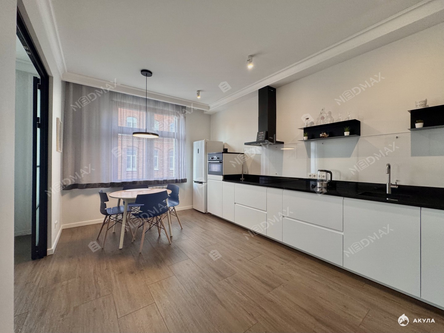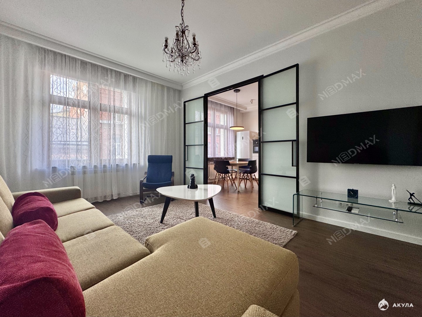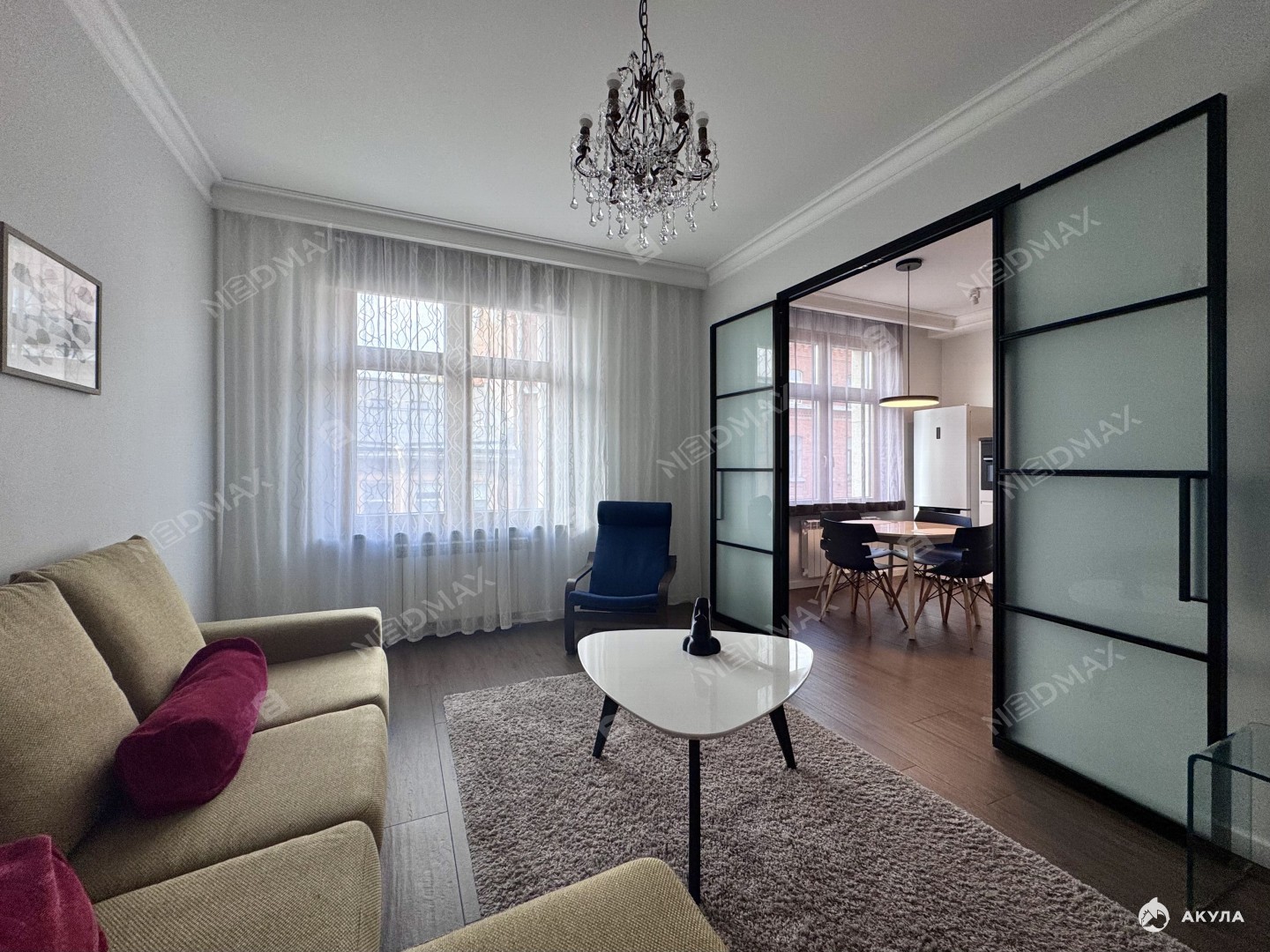 Выполнен качественный евроремонт по индивидуальному дизайн-проекту с использованием эко материалов. Планировка - спальня, просторная кухня - гостиная, два санузла, гардеробная комната. Комфортабельная мебель, современная техника. Кондиционер.