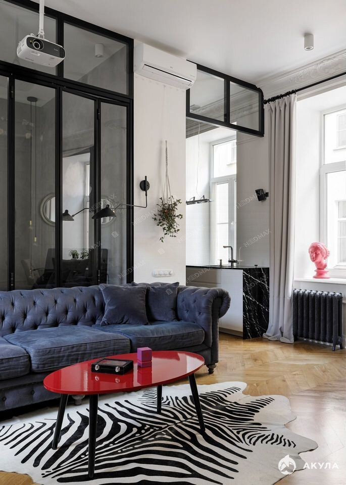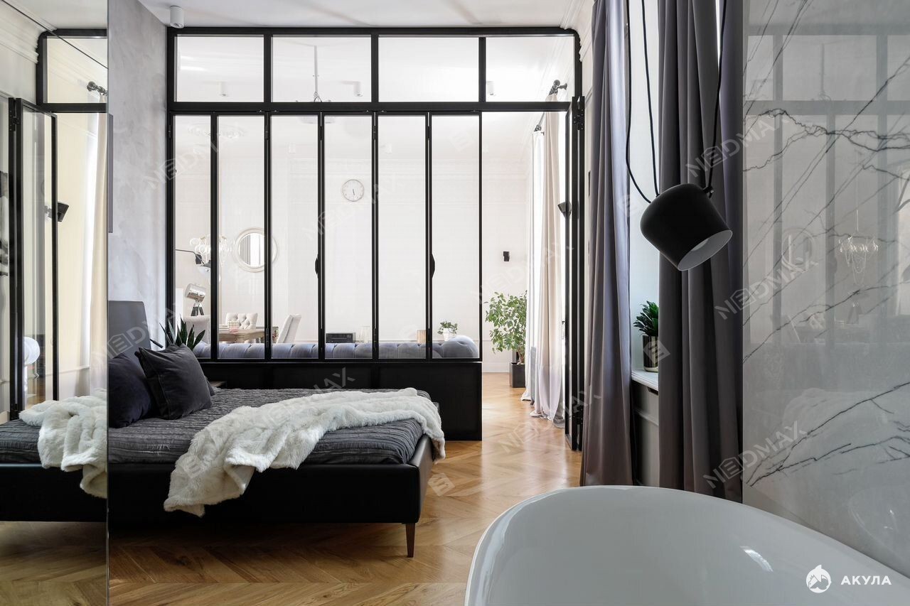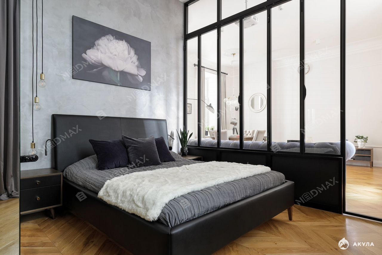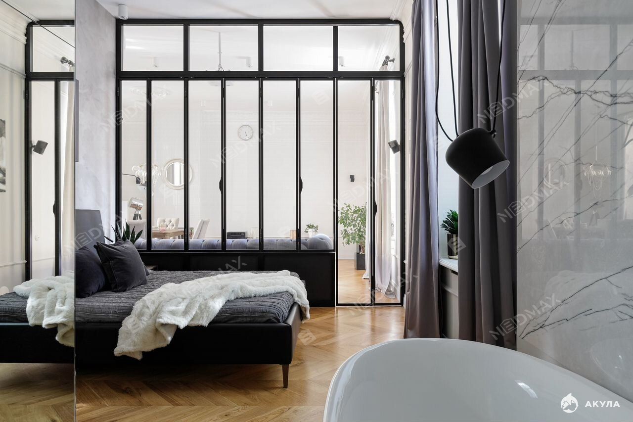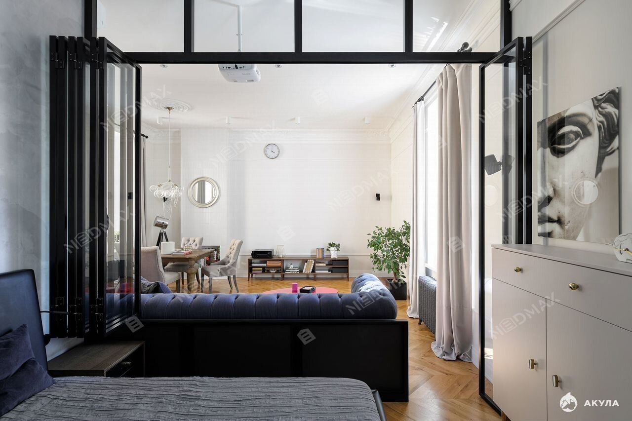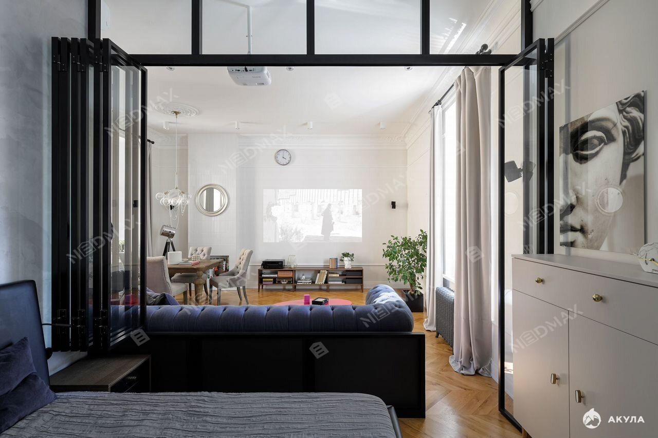 Просторное единое пространство, разделённое элегантной складной перегородкой для легкого зонирования, создаёт идеальный баланс между свободой и функциональностью.
