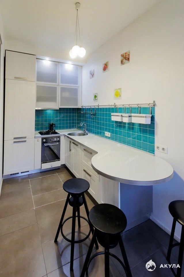 В зоне кухни есть все необходимое: духовой шкаф, газовая варочная панель, холодильник, посудомоечная машина. Много мест для хранения. Барная стойка со стульями. Предусмотрена система очистки воды и посуда Kuchenland. Теплый пол.