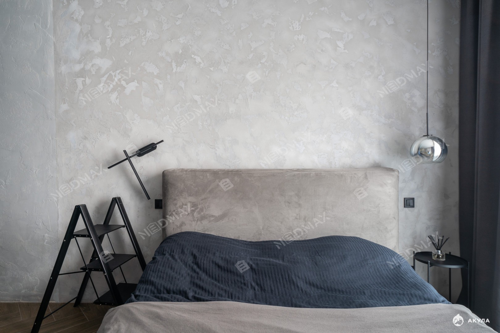 Планировка включает: Спальню с гардеробом, большой объединенный санузел с тропическим душем, и кухней-гостиной.