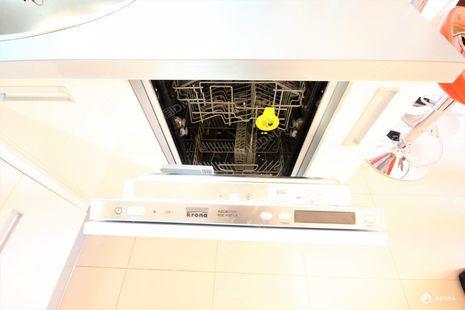 • Квартира оснащена импортной техникой: стиральной и посудомоечной машинами, холодильником, духовым шкафом и телевизором.