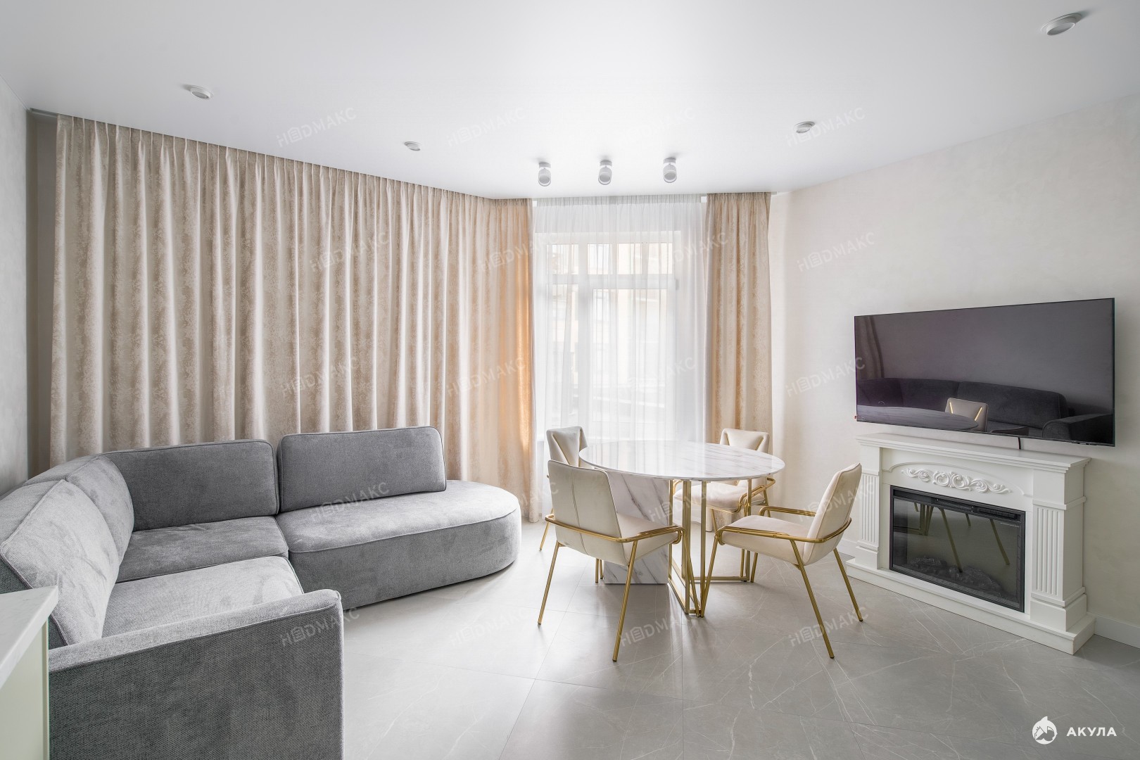 Зона гостиной оснащена удобным большим диваном для приема гостей, телевизором и электрическим камином для создания уюта.