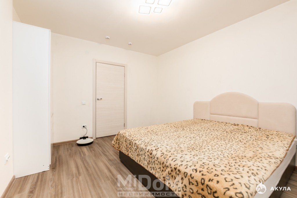 В спальне полноценная двуспальная кровать 180 на 200 см с ортопедическим матрасом. Есть новый комплект белья. В кровати выдвижные ящики. Так же в комнате шкаф для личных вещей и робот-пылесос