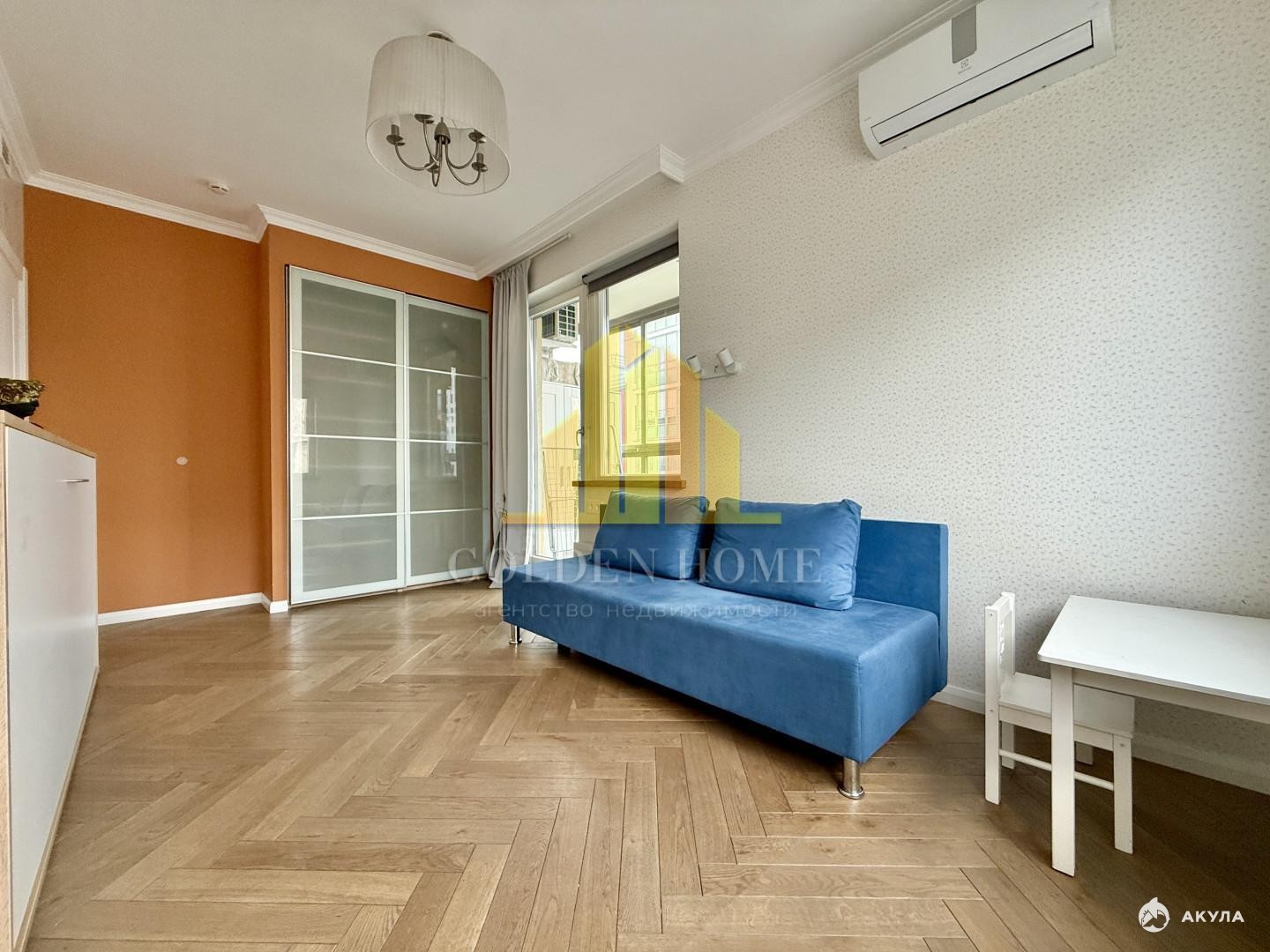 В одной из спален просторная кровать и отдельная гардеробная. Вторая спальня оборудована откидной кроватью и раскладным диваном, также здесь есть рабочая зона. В гостиной установлен большой диван и обеденный стол.