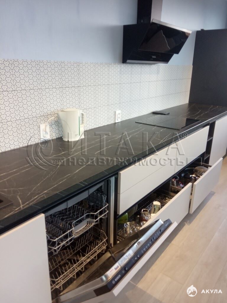 Имеется кухонный гарнитур, встроенная ПОСУДОМОЕЧНАЯ машина, стеклокерамич варочная поверхность, духовой шкаф, вытяжка электрическая, двухкамерный холодильник, стол, стулья, кухонные принадлежности,