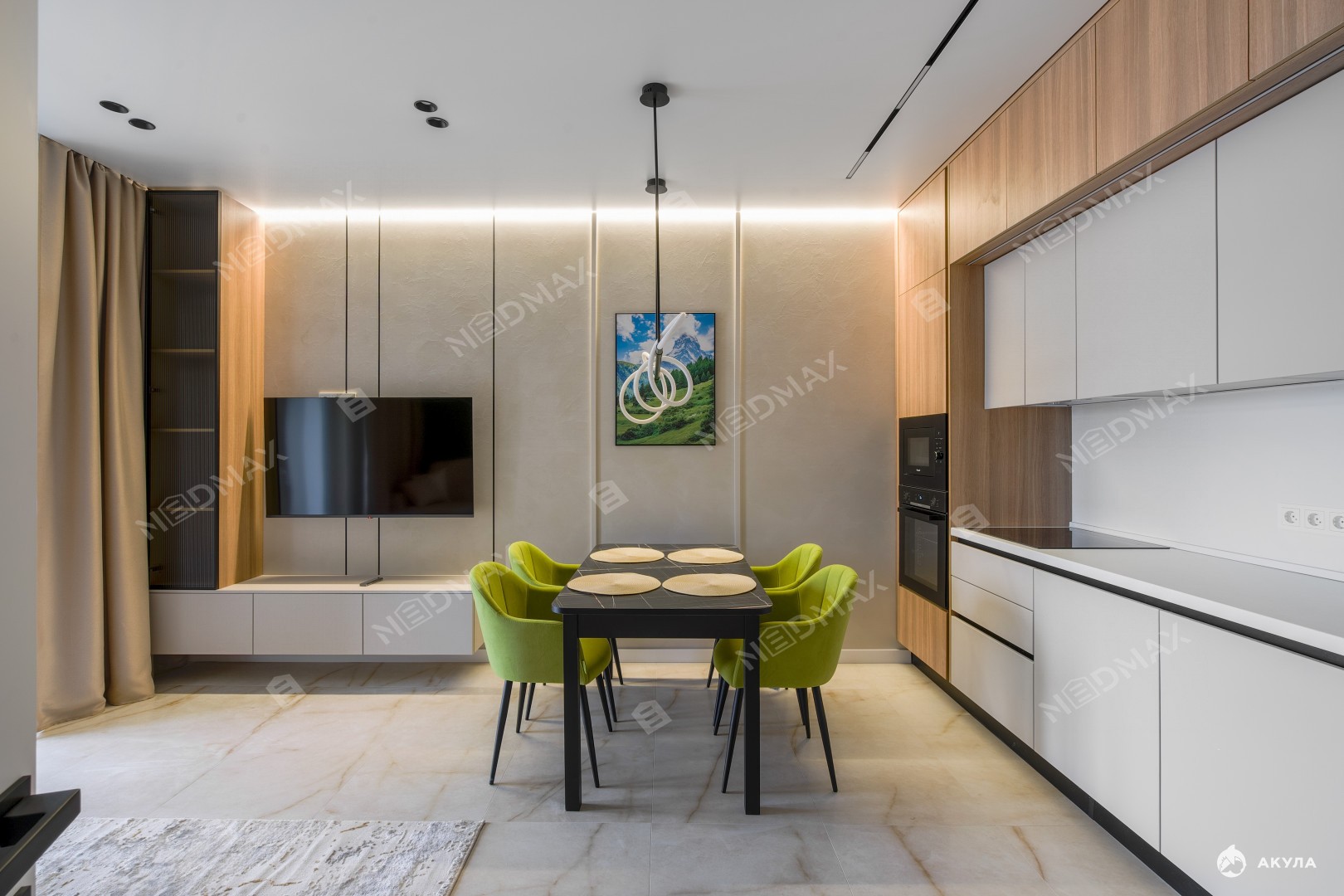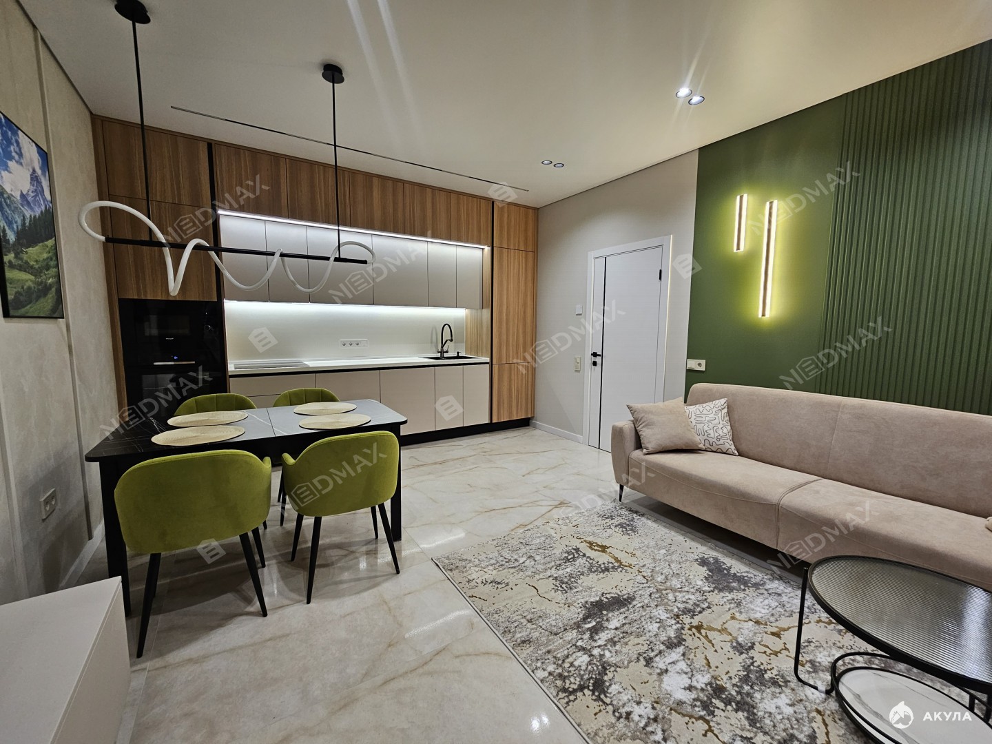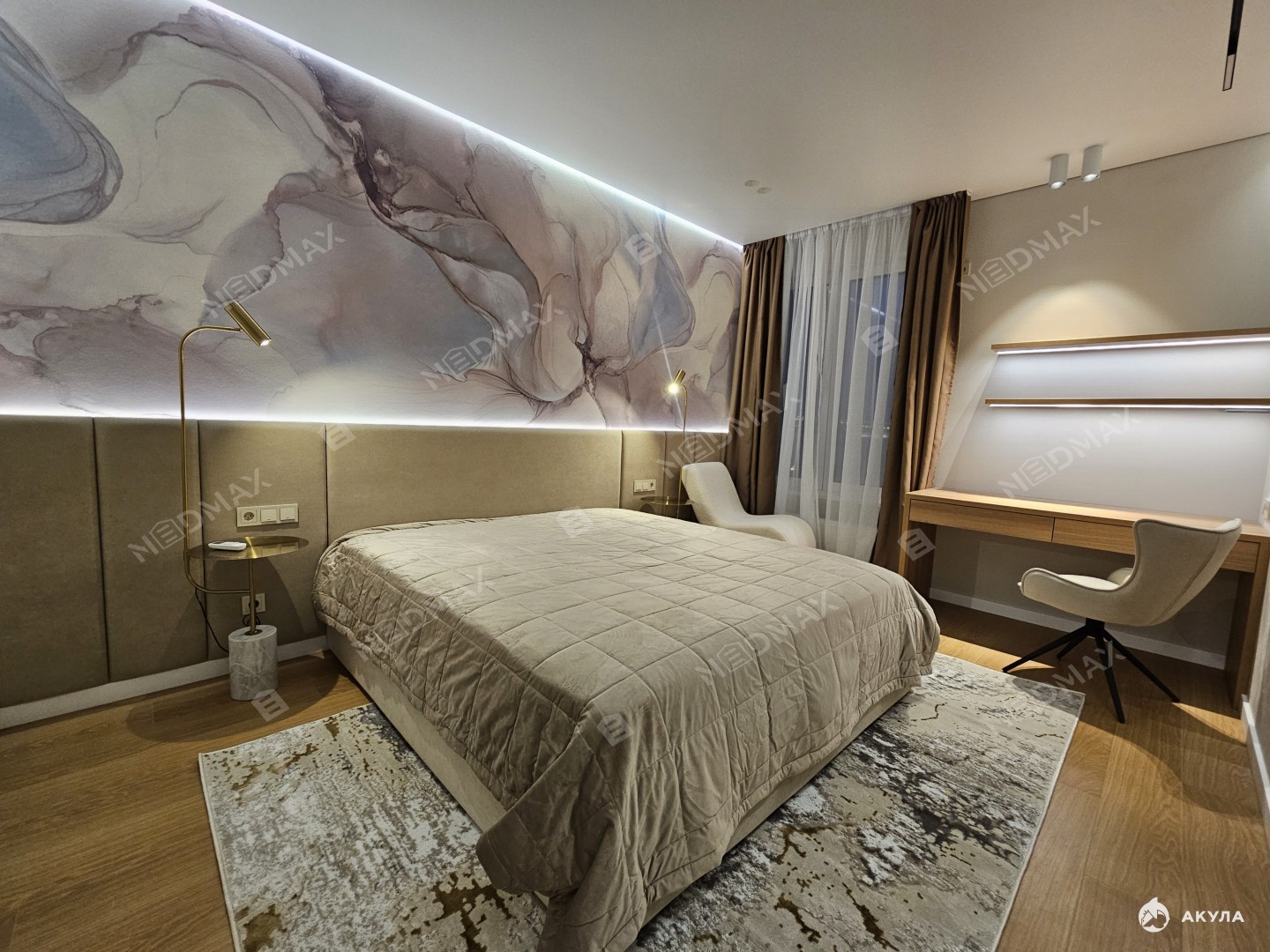 Много мест для хранения вещей. Два санузла: один с ванной, второй гостевой. В гостиной установлен кондиционер. В квартире много сценариев света.