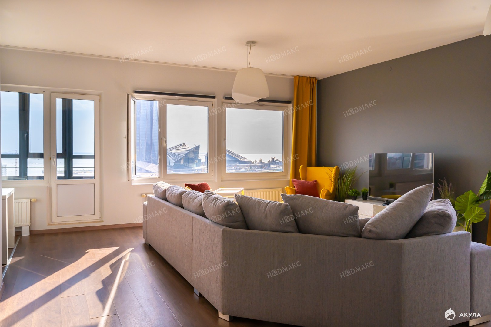 Два сан.узла. Две большие гардеробные. Спальная комната с лоджией с видом на Лахтинский разлив. Кабинет, из которого можно сделать детскую с видом на Лахтинский разлив. Большая гостиная с лоджией с видом на Лахту центр и Лахтинский разлив.