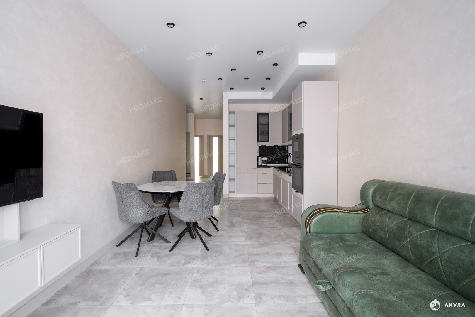 Зона гостиной: удобный раскладной диван и современный телевизор для большего уюта.