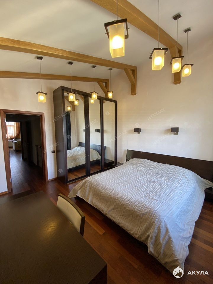 Качественный дизайнерский ремонт с применением дорогостоящих материалов: паркет, двери и лестница из редкого красного дерева Мербау, стены с декоративной и венецианской штукатуркой.