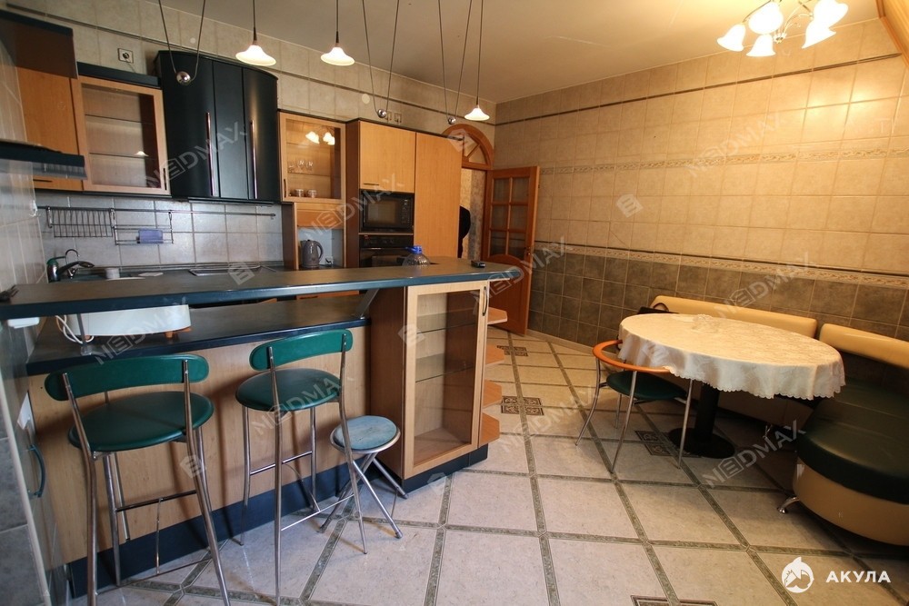 Квартира с классическим ремонтом располагается на двух этажах. Полностью укомплектована необходимой мебелью и техникой (варочная панель, микроволновая и духовая печь, посудомоечная и стиральная машины, два холодильника).