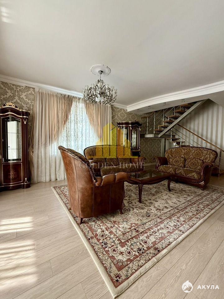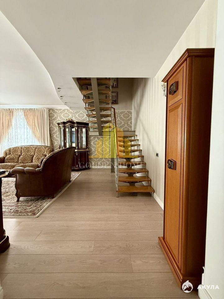 Квартира состоит из двух этажей и имеет продуманную планировку. На первом этаже расположены кухня, гостиная, гостевой санузел и места для хранения. На втором этаже находятся три изолированные спальни, два санузла, гардеробная и французский балкон.